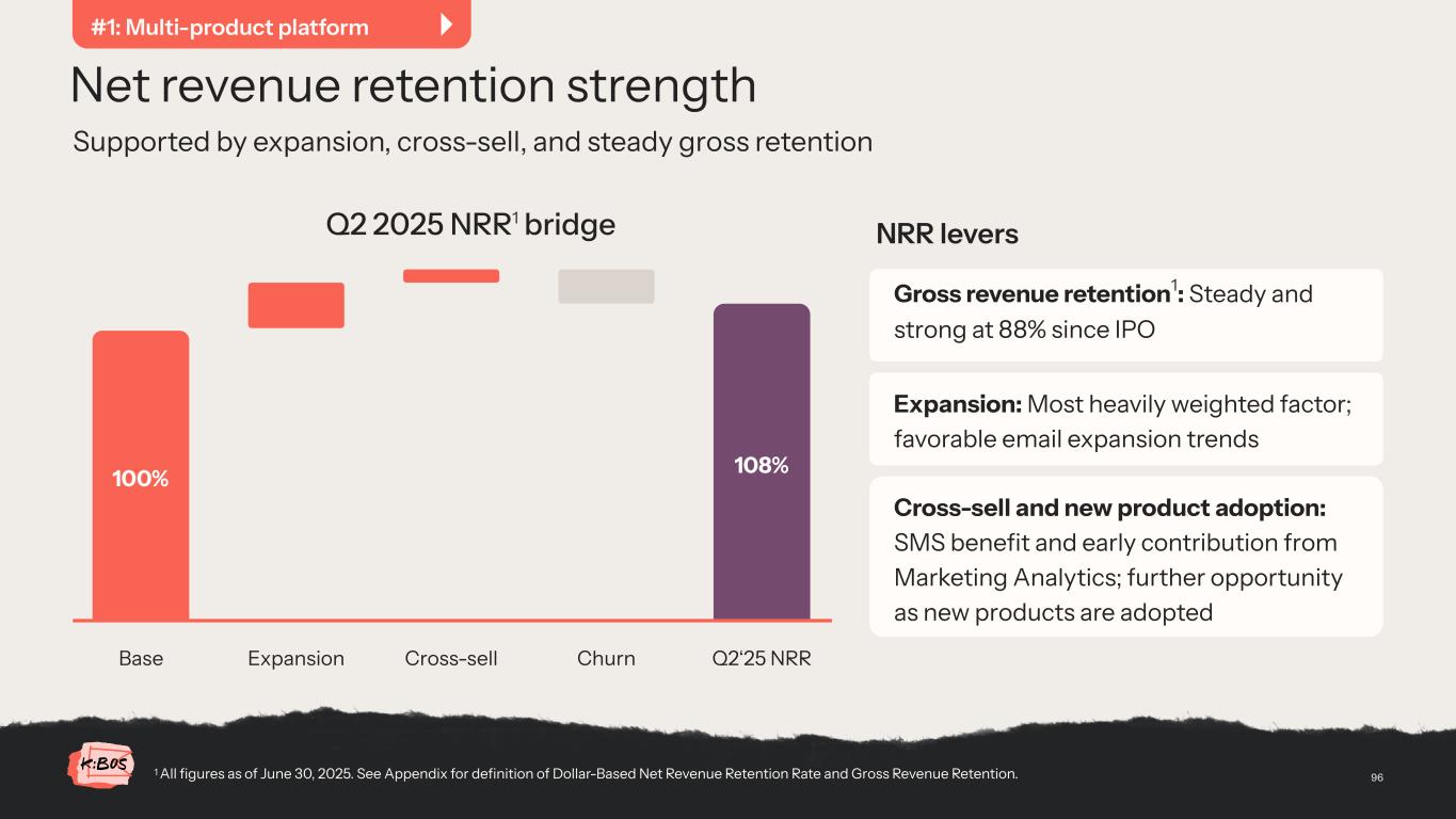 96 Net revenue retention strength Supported by expansion, cross-sell, and steady gross retention NRR levers Expansion: Most heavily weighted factor; favorable email expansion trends Cross-sell and new product adoption: SMS benefit and early contribution from Marketing Analytics; further opportunity as new products are adopted Gross revenue retention1: Steady and strong at 88% since IPO Q2 2025 NRR1 bridge Base Expansion Cross-sell Churn Q2‘25 NRR 100% 108% 1 All figures as of June 30, 2025. See Appendix for definition of Dollar-Based Net Revenue Retention Rate and Gross Revenue Retention. #1: Multi-product platform