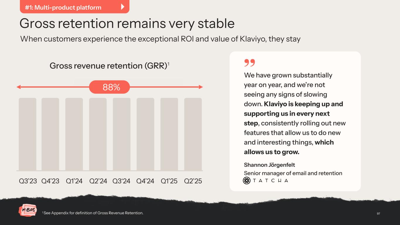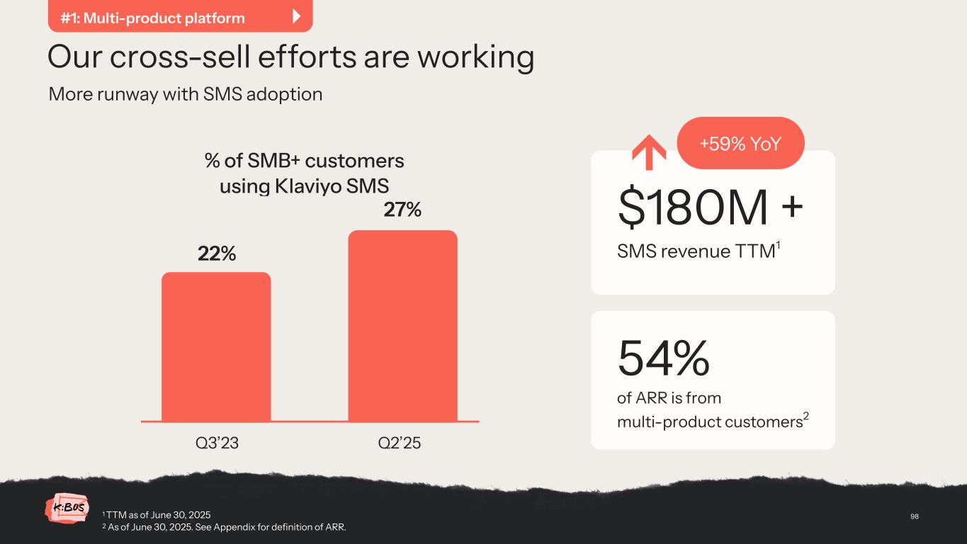 97 Q4’23 Q1’24 Q2’24 Q3‘24 Q4’24 Q1’25 Q2’25 Gross retention remains very stable We have grown substantially year on year, and we’re not seeing any signs of slowing down. Klaviyo is keeping up and supporting us in every next step, consistently rolling out new features that allow us to do new and interesting things, which allows us to grow. Shannon Jörgenfelt Senior manager of email and retention Gross revenue retention (GRR)1 88% When customers experience the exceptional ROI and value of Klaviyo, they stay 1 See Appendix for definition of Gross Revenue Retention. #1: Multi-product platform Q3’23