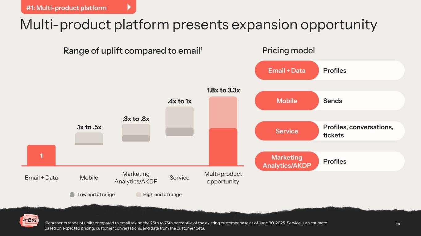 99 Multi-product platform presents expansion opportunity Range of uplift compared to email1 Email + Data Marketing Analytics/AKDP ServiceMobile Multi-product opportunity 1 Pricing model Profiles, conversations, ticketsService ProfilesMarketing Analytics/AKDP SendsMobile .3x to .8x .4x to 1x ProfilesEmail + Data .1x to .5x 1.8x to 3.3x 1Represents range of uplift compared to email taking the 25th to 75th percentile of the existing customer base as of June 30, 2025. Service is an estimate based on expected pricing, customer conversations, and data from the customer beta. High end of rangeLow end of range #1: Multi-product platform