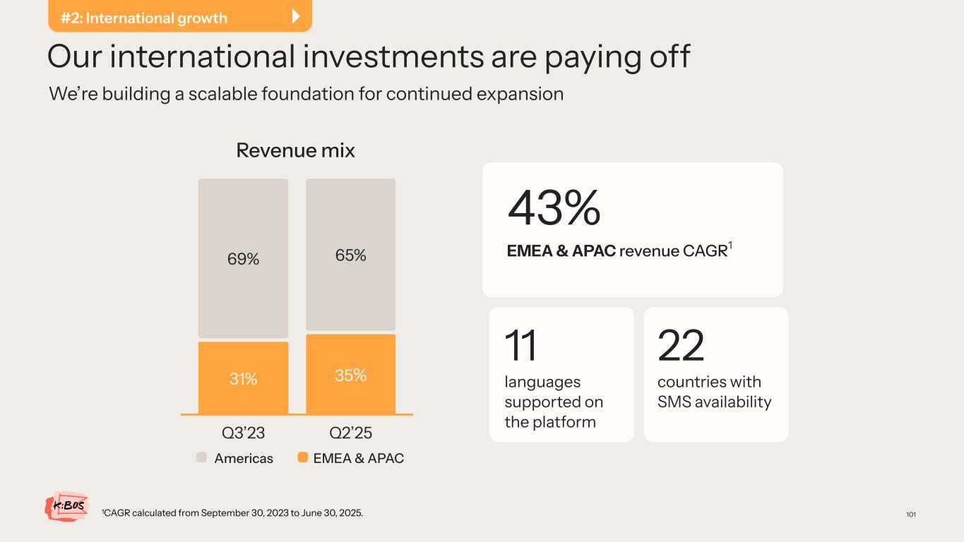 101 Our international investments are paying off #2: International growth We’re building a scalable foundation for continued expansion Q3’23 Q2’25 31% 69% 35% 65% EMEA & APACAmericas Revenue mix 43% EMEA & APAC revenue CAGR1 11 languages supported on the platform 22 countries with SMS availability 1CAGR calculated from September 30, 2023 to June 30, 2025.