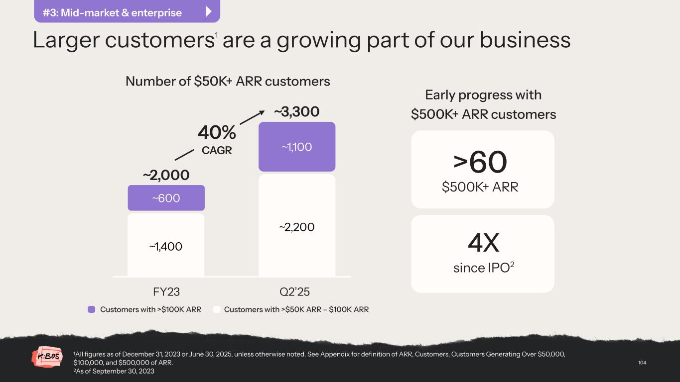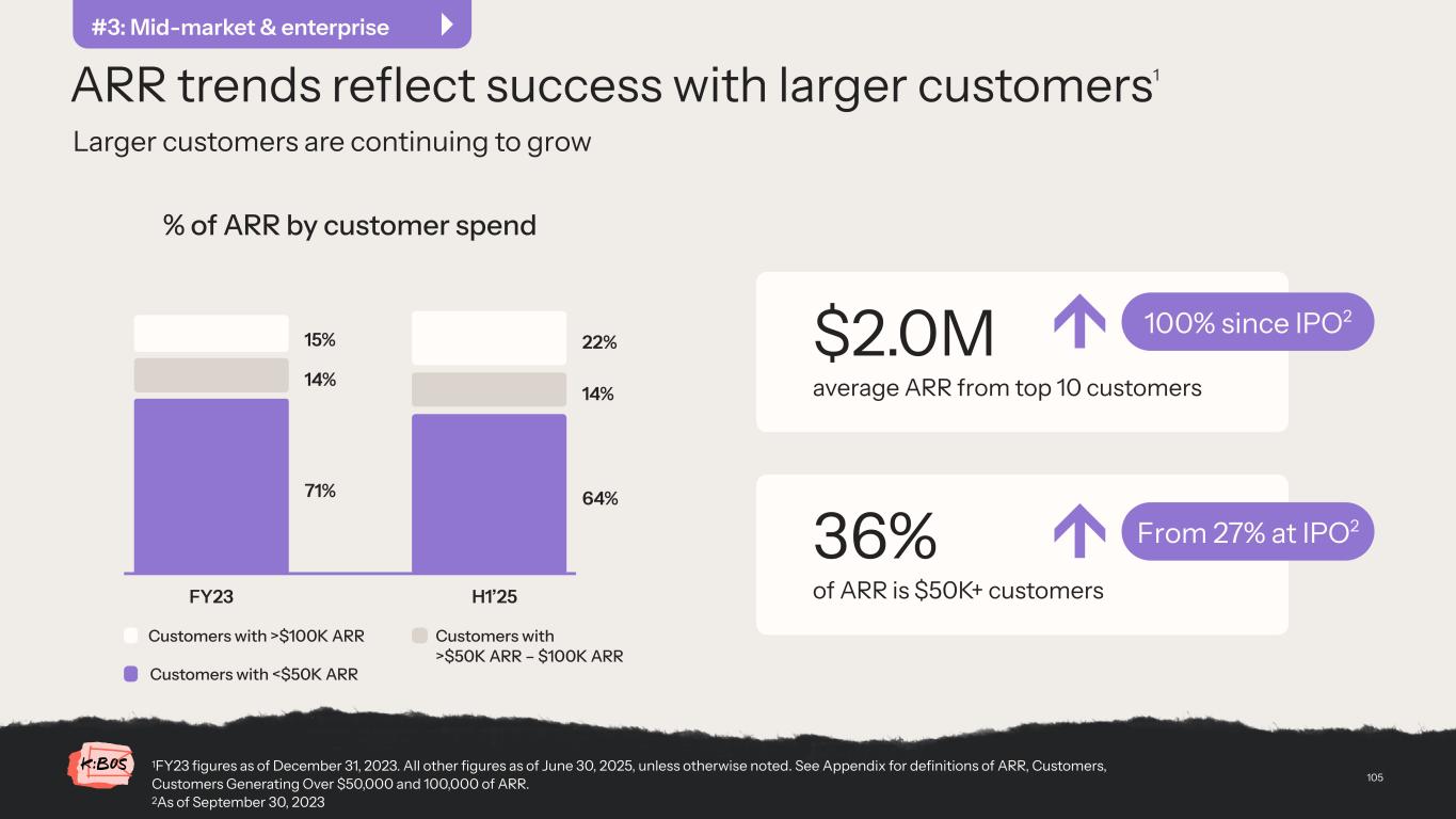 104 Larger customers1 are a growing part of our business #3: Mid-market & enterprise $500K+ ARR >60 4X since IPO2 Number of $50K+ ARR customers ~2,000 40% CAGR ~3,300 Early progress with $500K+ ARR customers Q2’25 ~600 ~1,100 ~1,400 ~2,200 FY23 Customers with >$50K ARR – $100K ARRCustomers with >$100K ARR 1All figures as of December 31, 2023 or June 30, 2025, unless otherwise noted. See Appendix for definition of ARR, Customers, Customers Generating Over $50,000, $100,000, and $500,000 of ARR. 2As of September 30, 2023