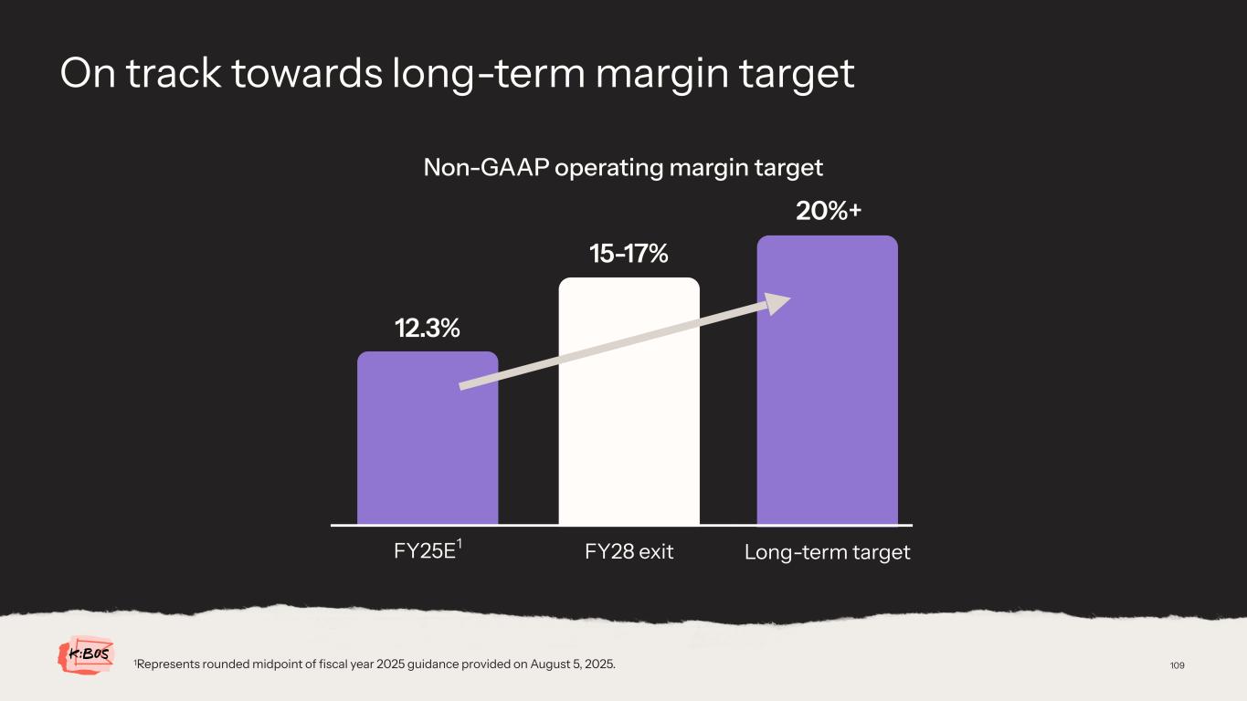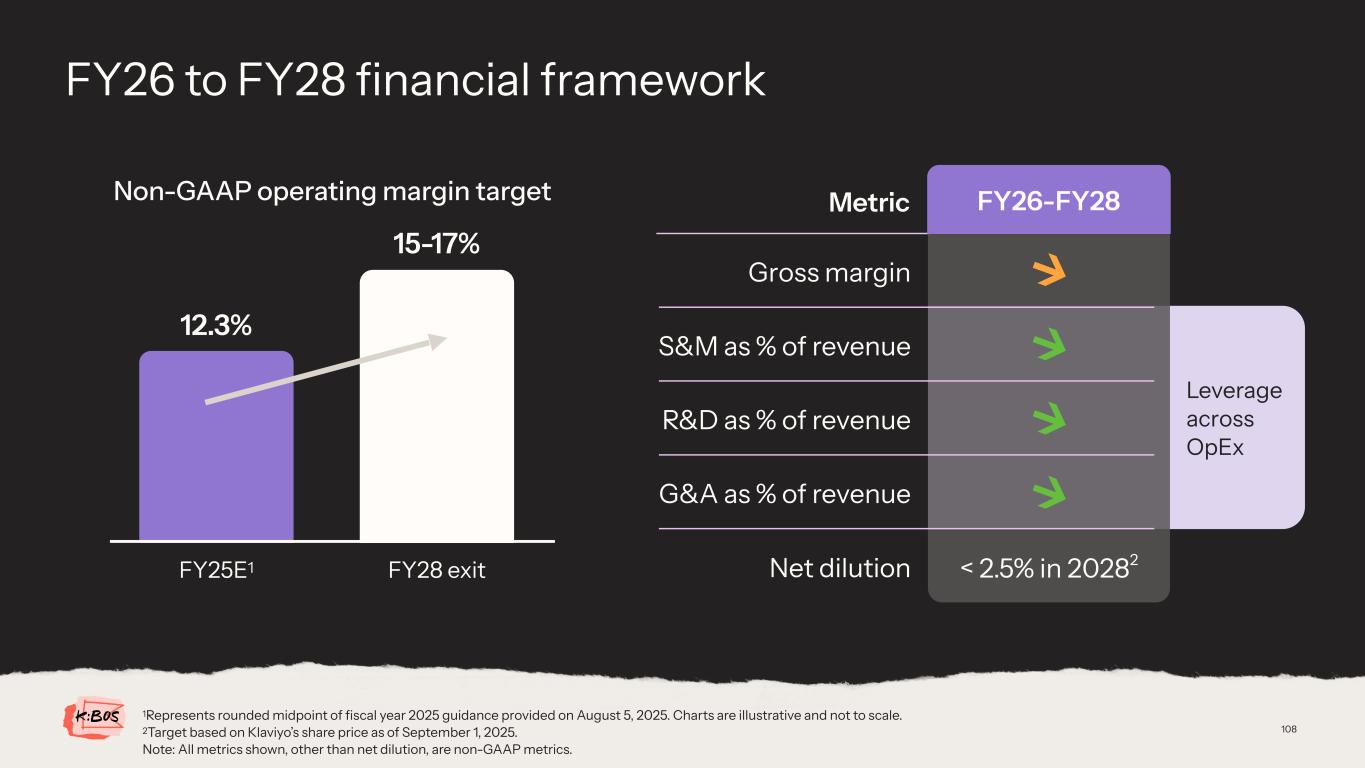 108 FY26 to FY28 financial framework 1Represents rounded midpoint of fiscal year 2025 guidance provided on August 5, 2025. Charts are illustrative and not to scale. 2Target based on Klaviyo’s share price as of September 1, 2025. Note: All metrics shown, other than net dilution, are non-GAAP metrics. Metric FY26-FY28 < 2.5% in 20282 ↑ Gross margin S&M as % of revenue R&D as % of revenue G&A as % of revenue Net dilution 12.3% FY28 exitFY25E1 15-17% ↑ ↑ ↑ Non-GAAP operating margin target Leverage across OpEx