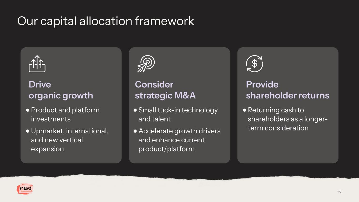 110 Our capital allocation framework Drive organic growth Consider strategic M&A Provide shareholder returns ●Product and platform investments ●Upmarket, international, and new vertical expansion ●Small tuck-in technology and talent ●Accelerate growth drivers and enhance current product/platform ●Returning cash to shareholders as a longer- term consideration