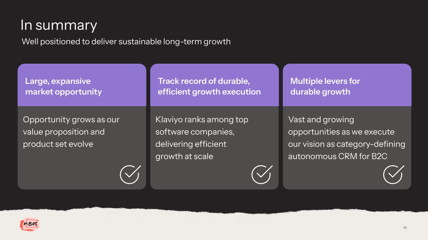 111 In summary Well positioned to deliver sustainable long-term growth Large, expansive market opportunity Opportunity grows as our value proposition and product set evolve Track record of durable, efficient growth execution Klaviyo ranks among top software companies, delivering efficient growth at scale Multiple levers for durable growth Vast and growing opportunities as we execute our vision as category-defining autonomous CRM for B2C