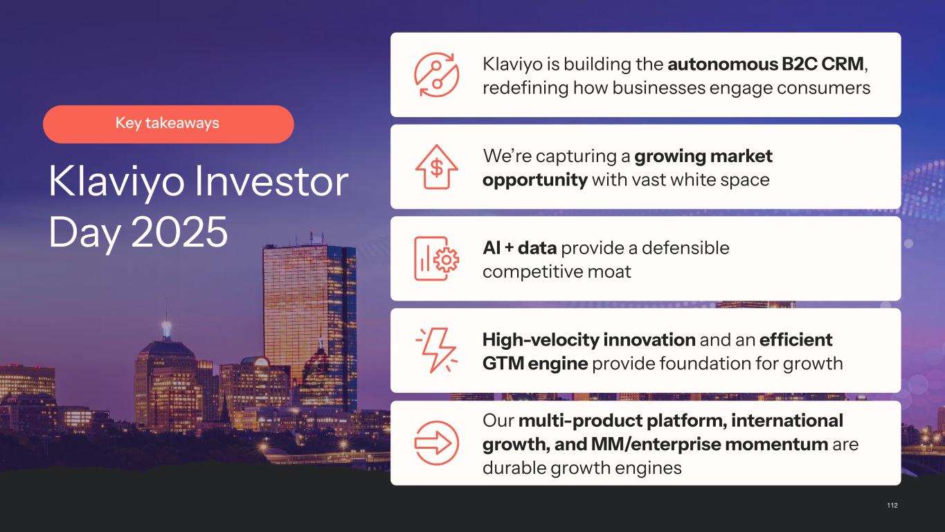 Klaviyo Investor Day 2025 Key takeaways We’re capturing a growing market opportunity with vast white space Klaviyo is building the autonomous B2C CRM, redefining how businesses engage consumers AI + data provide a defensible competitive moat High-velocity innovation and an efficient GTM engine provide foundation for growth Our multi-product platform, international growth, and MM/enterprise momentum are durable growth engines 112