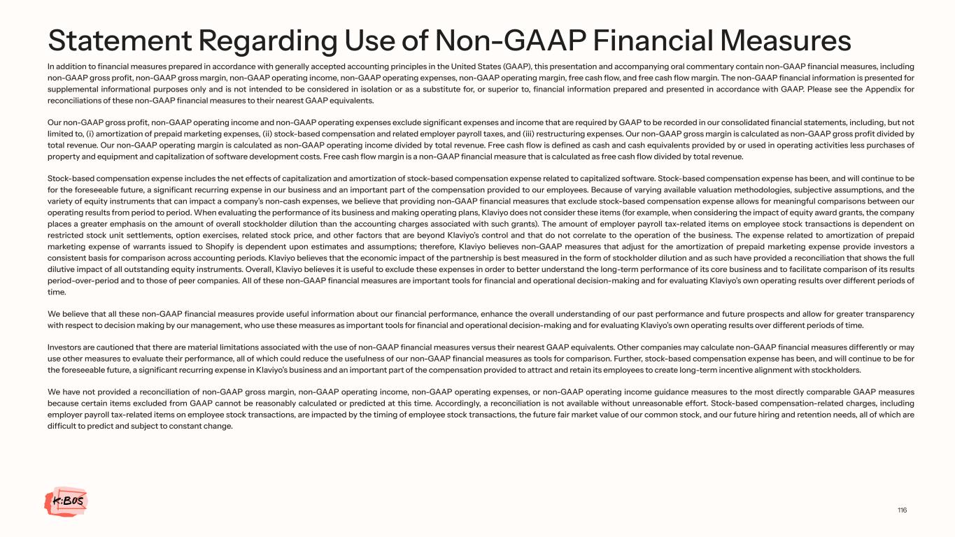 116 Statement Regarding Use of Non-GAAP Financial Measures In addition to financial measures prepared in accordance with generally accepted accounting principles in the United States (GAAP), this presentation and accompanying oral commentary contain non-GAAP financial measures, including non-GAAP gross profit, non-GAAP gross margin, non-GAAP operating income, non-GAAP operating expenses, non-GAAP operating margin, free cash flow, and free cash flow margin. The non-GAAP financial information is presented for supplemental informational purposes only and is not intended to be considered in isolation or as a substitute for, or superior to, financial information prepared and presented in accordance with GAAP. Please see the Appendix for reconciliations of these non-GAAP financial measures to their nearest GAAP equivalents. Our non-GAAP gross profit, non-GAAP operating income and non-GAAP operating expenses exclude significant expenses and income that are required by GAAP to be recorded in our consolidated financial statements, including, but not limited to, (i) amortization of prepaid marketing expenses, (ii) stock-based compensation and related employer payroll taxes, and (iii) restructuring expenses. Our non-GAAP gross margin is calculated as non-GAAP gross profit divided by total revenue. Our non-GAAP operating margin is calculated as non-GAAP operating income divided by total revenue. Free cash flow is defined as cash and cash equivalents provided by or used in operating activities less purchases of property and equipment and capitalization of software development costs. Free cash flow margin is a non-GAAP financial measure that is calculated as free cash flow divided by total revenue. Stock-based compensation expense includes the net effects of capitalization and amortization of stock-based compensation expense related to capitalized software. Stock-based compensation expense has been, and will continue to be for the foreseeable future, a significant recurring expense in our business and an important part of the compensation provided to our employees. Because of varying available valuation methodologies, subjective assumptions, and the variety of equity instruments that can impact a company’s non-cash expenses, we believe that providing non-GAAP financial measures that exclude stock-based compensation expense allows for meaningful comparisons between our operating results from period to period. When evaluating the performance of its business and making operating plans, Klaviyo does not consider these items (for example, when considering the impact of equity award grants, the company places a greater emphasis on the amount of overall stockholder dilution than the accounting charges associated with such grants). The amount of employer payroll tax-related items on employee stock transactions is dependent on restricted stock unit settlements, option exercises, related stock price, and other factors that are beyond Klaviyo’s control and that do not correlate to the operation of the business. The expense related to amortization of prepaid marketing expense of warrants issued to Shopify is dependent upon estimates and assumptions; therefore, Klaviyo believes non-GAAP measures that adjust for the amortization of prepaid marketing expense provide investors a consistent basis for comparison across accounting periods. Klaviyo believes that the economic impact of the partnership is best measured in the form of stockholder dilution and as such have provided a reconciliation that shows the full dilutive impact of all outstanding equity instruments. Overall, Klaviyo believes it is useful to exclude these expenses in order to better understand the long-term performance of its core business and to facilitate comparison of its results period-over-period and to those of peer companies. All of these non-GAAP financial measures are important tools for financial and operational decision-making and for evaluating Klaviyo’s own operating results over different periods of time. We believe that all these non-GAAP financial measures provide useful information about our financial performance, enhance the overall understanding of our past performance and future prospects and allow for greater transparency with respect to decision making by our management, who use these measures as important tools for financial and operational decision-making and for evaluating Klaviyo’s own operating results over different periods of time. Investors are cautioned that there are material limitations associated with the use of non-GAAP financial measures versus their nearest GAAP equivalents. Other companies may calculate non-GAAP financial measures differently or may use other measures to evaluate their performance, all of which could reduce the usefulness of our non-GAAP financial measures as tools for comparison. Further, stock-based compensation expense has been, and will continue to be for the foreseeable future, a significant recurring expense in Klaviyo’s business and an important part of the compensation provided to attract and retain its employees to create long-term incentive alignment with stockholders. We have not provided a reconciliation of non-GAAP gross margin, non-GAAP operating income, non-GAAP operating expenses, or non-GAAP operating income guidance measures to the most directly comparable GAAP measures because certain items excluded from GAAP cannot be reasonably calculated or predicted at this time. Accordingly, a reconciliation is not available without unreasonable effort. Stock-based compensation-related charges, including employer payroll tax-related items on employee stock transactions, are impacted by the timing of employee stock transactions, the future fair market value of our common stock, and our future hiring and retention needs, all of which are difficult to predict and subject to constant change.