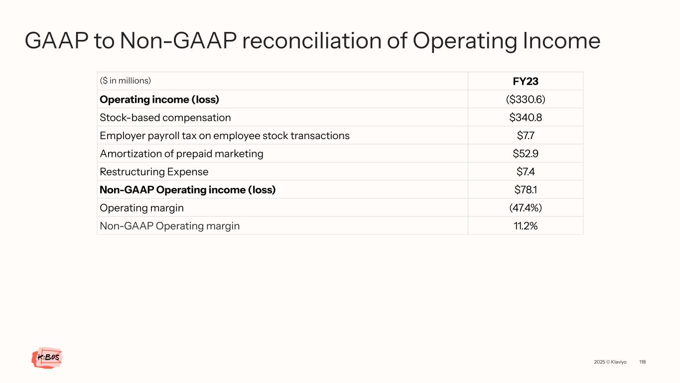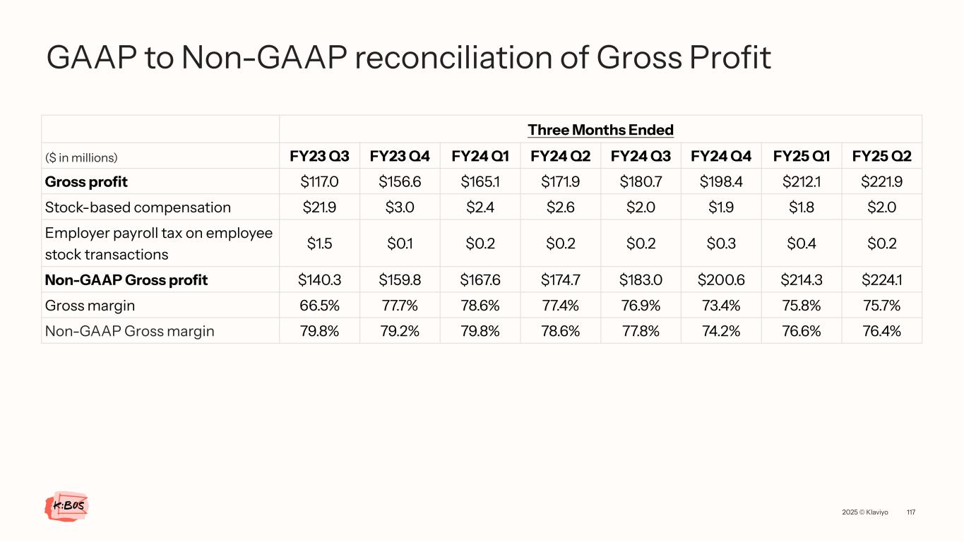 2025 © Klaviyo 117 GAAP to Non-GAAP reconciliation of Gross Profit Three Months Ended ($ in millions) FY23 Q3 FY23 Q4 FY24 Q1 FY24 Q2 FY24 Q3 FY24 Q4 FY25 Q1 FY25 Q2 Gross profit $117.0 $156.6 $165.1 $171.9 $180.7 $198.4 $212.1 $221.9 Stock-based compensation $21.9 $3.0 $2.4 $2.6 $2.0 $1.9 $1.8 $2.0 Employer payroll tax on employee stock transactions $1.5 $0.1 $0.2 $0.2 $0.2 $0.3 $0.4 $0.2 Non-GAAP Gross profit $140.3 $159.8 $167.6 $174.7 $183.0 $200.6 $214.3 $224.1 Gross margin 66.5% 77.7% 78.6% 77.4% 76.9% 73.4% 75.8% 75.7% Non-GAAP Gross margin 79.8% 79.2% 79.8% 78.6% 77.8% 74.2% 76.6% 76.4%