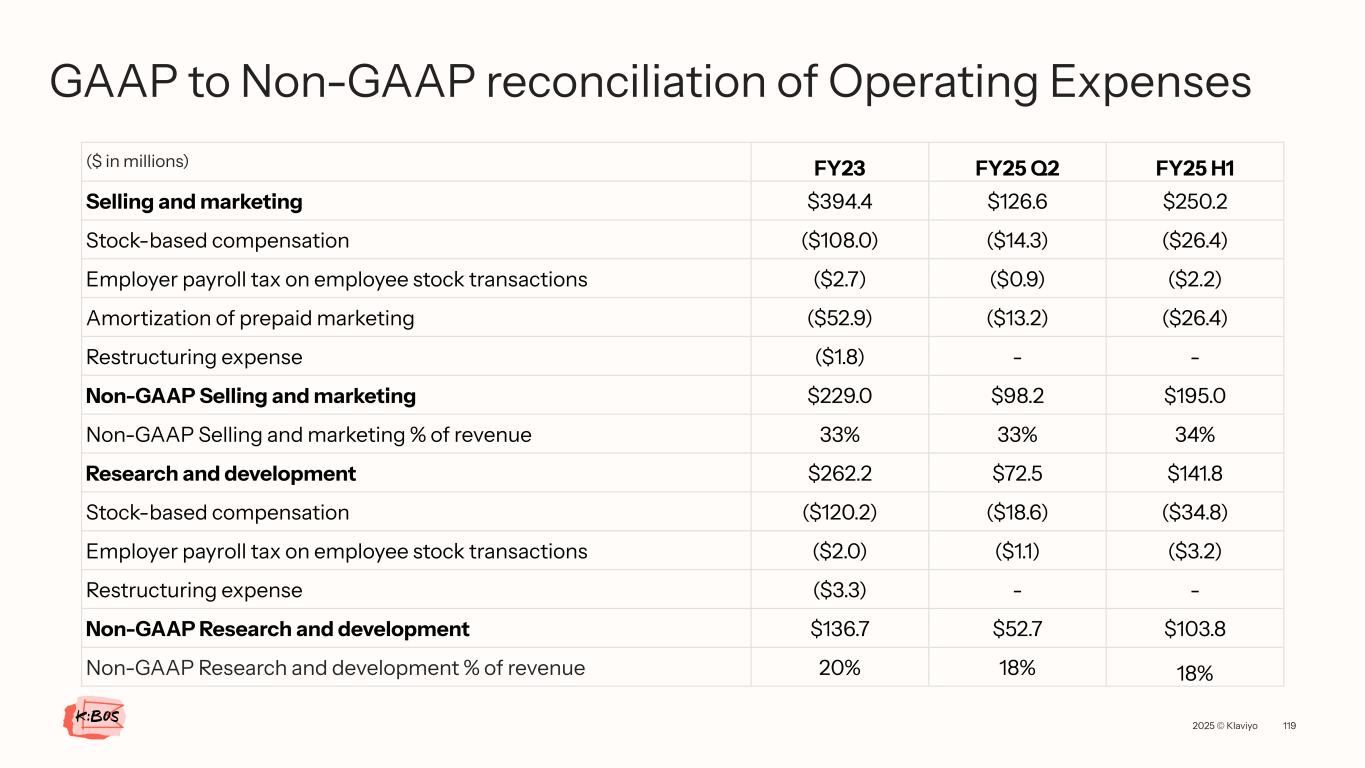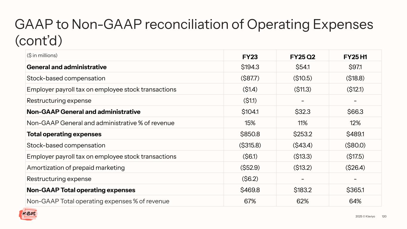 2025 © Klaviyo 119 GAAP to Non-GAAP reconciliation of Operating Expenses ($ in millions) FY23 FY25 Q2 FY25 H1 Selling and marketing $394.4 $126.6 $250.2 Stock-based compensation ($108.0) ($14.3) ($26.4) Employer payroll tax on employee stock transactions ($2.7) ($0.9) ($2.2) Amortization of prepaid marketing ($52.9) ($13.2) ($26.4) Restructuring expense ($1.8) - - Non-GAAP Selling and marketing $229.0 $98.2 $195.0 Non-GAAP Selling and marketing % of revenue 33% 33% 34% Research and development $262.2 $72.5 $141.8 Stock-based compensation ($120.2) ($18.6) ($34.8) Employer payroll tax on employee stock transactions ($2.0) ($1.1) ($3.2) Restructuring expense ($3.3) - - Non-GAAP Research and development $136.7 $52.7 $103.8 Non-GAAP Research and development % of revenue 20% 18% 18%