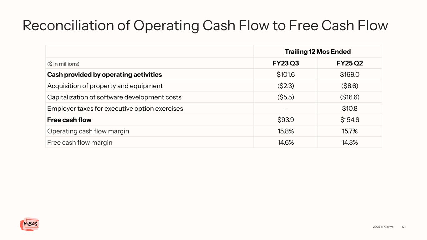 2025 © Klaviyo 121 Reconciliation of Operating Cash Flow to Free Cash Flow Trailing 12 Mos Ended ($ in millions) FY23 Q3 FY25 Q2 Cash provided by operating activities $101.6 $169.0 Acquisition of property and equipment ($2.3) ($8.6) Capitalization of software development costs ($5.5) ($16.6) Employer taxes for executive option exercises - $10.8 Free cash flow $93.9 $154.6 Operating cash flow margin 15.8% 15.7% Free cash flow margin 14.6% 14.3%