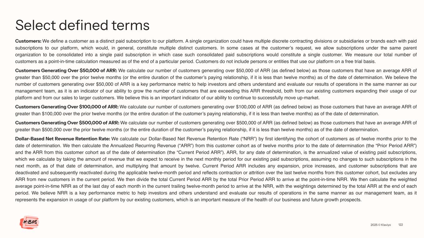 2025 © Klaviyo 122 Select defined terms Customers: We define a customer as a distinct paid subscription to our platform. A single organization could have multiple discrete contracting divisions or subsidiaries or brands each with paid subscriptions to our platform, which would, in general, constitute multiple distinct customers. In some cases at the customer’s request, we allow subscriptions under the same parent organization to be consolidated into a single paid subscription in which case such consolidated paid subscriptions would constitute a single customer. We measure our total number of customers as a point-in-time calculation measured as of the end of a particular period. Customers do not include persons or entities that use our platform on a free trial basis. Customers Generating Over $50,000 of ARR: We calculate our number of customers generating over $50,000 of ARR (as defined below) as those customers that have an average ARR of greater than $50,000 over the prior twelve months (or the entire duration of the customer’s paying relationship, if it is less than twelve months) as of the date of determination. We believe the number of customers generating over $50,000 of ARR is a key performance metric to help investors and others understand and evaluate our results of operations in the same manner as our management team, as it is an indicator of our ability to grow the number of customers that are exceeding this ARR threshold, both from our existing customers expanding their usage of our platform and from our sales to larger customers. We believe this is an important indicator of our ability to continue to successfully move up-market. Customers Generating Over $100,000 of ARR: We calculate our number of customers generating over $100,000 of ARR (as defined below) as those customers that have an average ARR of greater than $100,000 over the prior twelve months (or the entire duration of the customer’s paying relationship, if it is less than twelve months) as of the date of determination. Customers Generating Over $500,000 of ARR: We calculate our number of customers generating over $500,000 of ARR (as defined below) as those customers that have an average ARR of greater than $500,000 over the prior twelve months (or the entire duration of the customer’s paying relationship, if it is less than twelve months) as of the date of determination. Dollar-Based Net Revenue Retention Rate: We calculate our Dollar-Based Net Revenue Retention Rate (“NRR”) by first identifying the cohort of customers as of twelve months prior to the date of determination. We then calculate the Annualized Recurring Revenue (“ARR”) from this customer cohort as of twelve months prior to the date of determination (the “Prior Period ARR”) and the ARR from this customer cohort as of the date of determination (the “Current Period ARR”). ARR, for any date of determination, is the annualized value of existing paid subscriptions, which we calculate by taking the amount of revenue that we expect to receive in the next monthly period for our existing paid subscriptions, assuming no changes to such subscriptions in the next month, as of that date of determination, and multiplying that amount by twelve. Current Period ARR includes any expansion, price increases, and customer subscriptions that are deactivated and subsequently reactivated during the applicable twelve-month period and reflects contraction or attrition over the last twelve months from this customer cohort, but excludes any ARR from new customers in the current period. We then divide the total Current Period ARR by the total Prior Period ARR to arrive at the point-in-time NRR. We then calculate the weighted average point-in-time NRR as of the last day of each month in the current trailing twelve-month period to arrive at the NRR, with the weightings determined by the total ARR at the end of each period. We believe NRR is a key performance metric to help investors and others understand and evaluate our results of operations in the same manner as our management team, as it represents the expansion in usage of our platform by our existing customers, which is an important measure of the health of our business and future growth prospects. 1222025 © Klaviyo