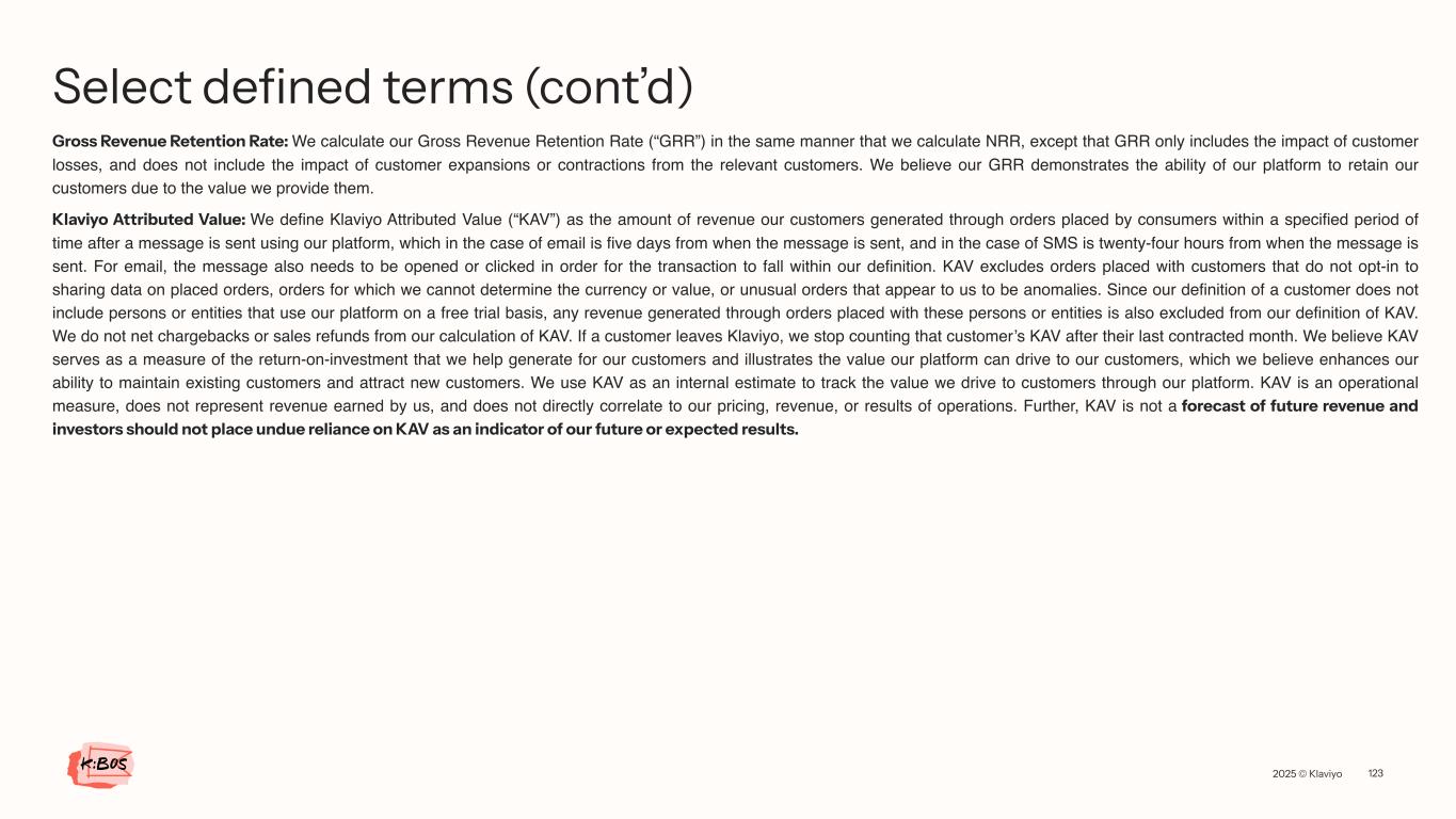 2025 © Klaviyo 123 Select defined terms (cont’d) 1232025 © Klaviyo Gross Revenue Retention Rate: We calculate our Gross Revenue Retention Rate (“GRR”) in the same manner that we calculate NRR, except that GRR only includes the impact of customer losses, and does not include the impact of customer expansions or contractions from the relevant customers. We believe our GRR demonstrates the ability of our platform to retain our customers due to the value we provide them. Klaviyo Attributed Value: We define Klaviyo Attributed Value (“KAV”) as the amount of revenue our customers generated through orders placed by consumers within a specified period of time after a message is sent using our platform, which in the case of email is five days from when the message is sent, and in the case of SMS is twenty-four hours from when the message is sent. For email, the message also needs to be opened or clicked in order for the transaction to fall within our definition. KAV excludes orders placed with customers that do not opt-in to sharing data on placed orders, orders for which we cannot determine the currency or value, or unusual orders that appear to us to be anomalies. Since our definition of a customer does not include persons or entities that use our platform on a free trial basis, any revenue generated through orders placed with these persons or entities is also excluded from our definition of KAV. We do not net chargebacks or sales refunds from our calculation of KAV. If a customer leaves Klaviyo, we stop counting that customer’s KAV after their last contracted month. We believe KAV serves as a measure of the return-on-investment that we help generate for our customers and illustrates the value our platform can drive to our customers, which we believe enhances our ability to maintain existing customers and attract new customers. We use KAV as an internal estimate to track the value we drive to customers through our platform. KAV is an operational measure, does not represent revenue earned by us, and does not directly correlate to our pricing, revenue, or results of operations. Further, KAV is not a forecast of future revenue and investors should not place undue reliance on KAV as an indicator of our future or expected results.