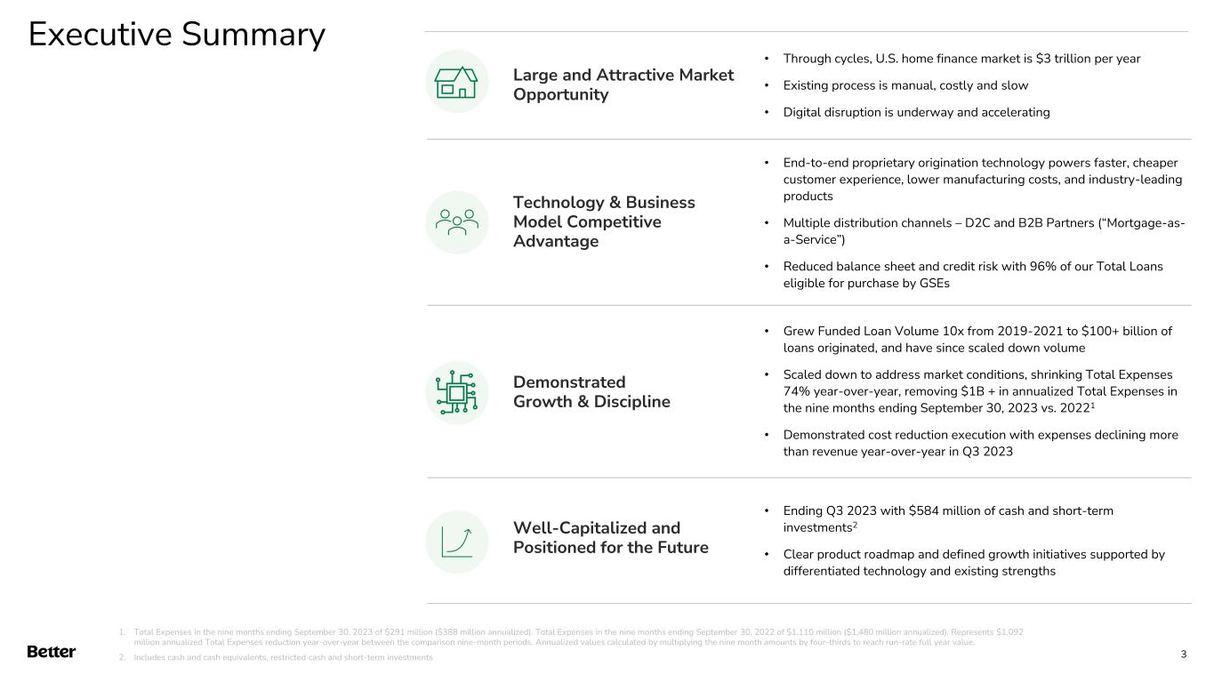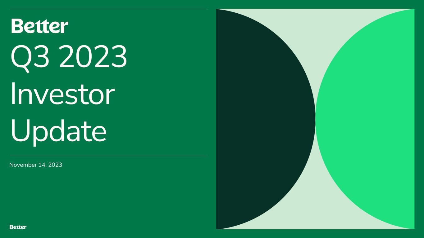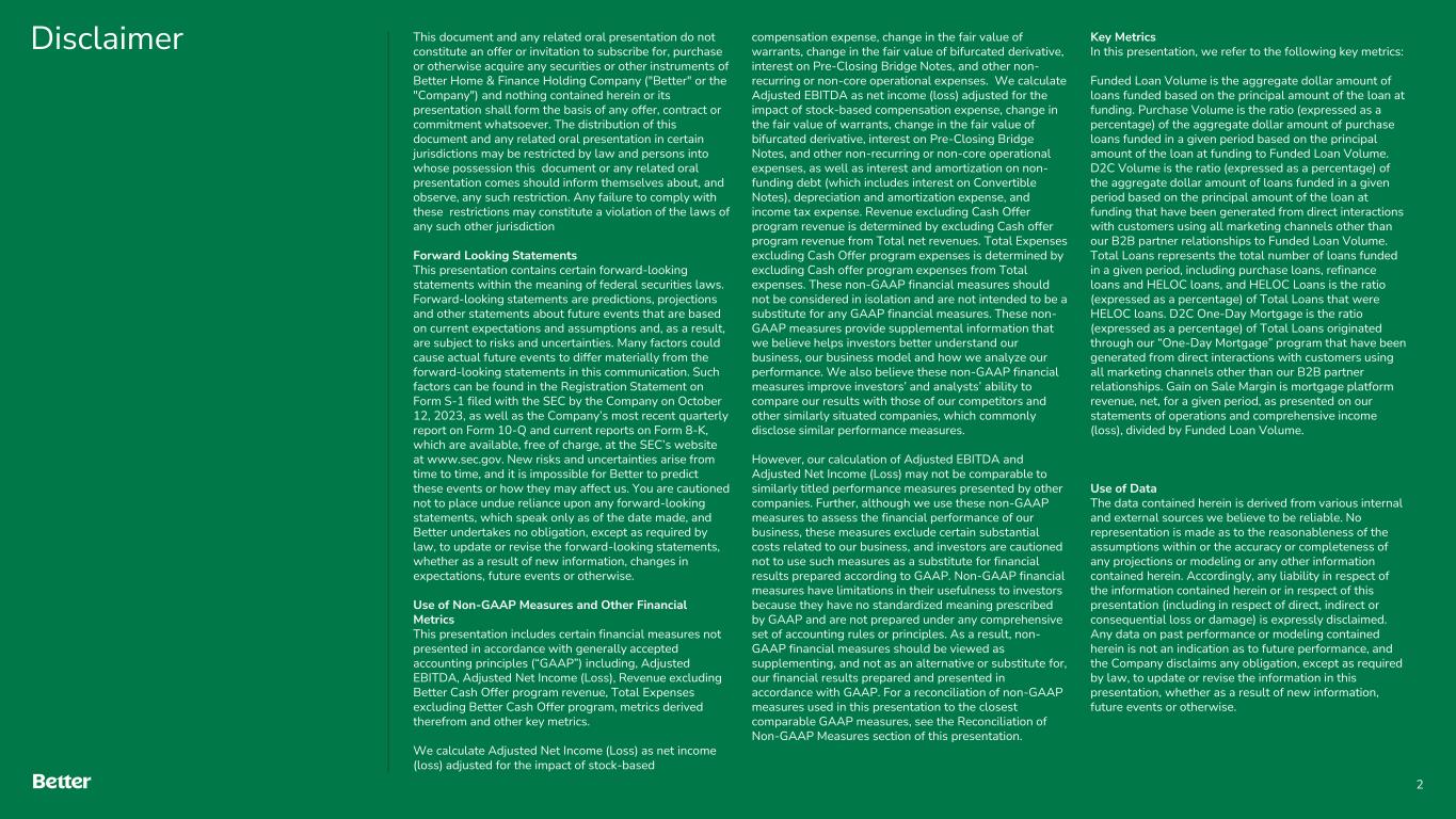 Disclaimer This document and any related oral presentation do not constitute an offer or invitation to subscribe for, purchase or otherwise acquire any securities or other instruments of Better Home & Finance Holding Company ("Better" or the "Company") and nothing contained herein or its presentation shall form the basis of any offer, contract or commitment whatsoever. The distribution of this document and any related oral presentation in certain jurisdictions may be restricted by law and persons into whose possession this document or any related oral presentation comes should inform themselves about, and observe, any such restriction. Any failure to comply with these restrictions may constitute a violation of the laws of any such other jurisdiction Forward Looking Statements This presentation contains certain forward-looking statements within the meaning of federal securities laws. Forward-looking statements are predictions, projections and other statements about future events that are based on current expectations and assumptions and, as a result, are subject to risks and uncertainties. Many factors could cause actual future events to differ materially from the forward-looking statements in this communication. Such factors can be found in the Registration Statement on Form S-1 filed with the SEC by the Company on October 12, 2023, as well as the Company’s most recent quarterly report on Form 10-Q and current reports on Form 8-K, which are available, free of charge, at the SEC’s website at www.sec.gov. New risks and uncertainties arise from time to time, and it is impossible for Better to predict these events or how they may affect us. You are cautioned not to place undue reliance upon any forward-looking statements, which speak only as of the date made, and Better undertakes no obligation, except as required by law, to update or revise the forward-looking statements, whether as a result of new information, changes in expectations, future events or otherwise. Use of Non-GAAP Measures and Other Financial Metrics This presentation includes certain financial measures not presented in accordance with generally accepted accounting principles (“GAAP”) including, Adjusted EBITDA, Adjusted Net Income (Loss), Revenue excluding Better Cash Offer program revenue, Total Expenses excluding Better Cash Offer program, metrics derived therefrom and other key metrics. We calculate Adjusted Net Income (Loss) as net income (loss) adjusted for the impact of stock-based compensation expense, change in the fair value of warrants, change in the fair value of bifurcated derivative, interest on Pre-Closing Bridge Notes, and other non- recurring or non-core operational expenses. We calculate Adjusted EBITDA as net income (loss) adjusted for the impact of stock-based compensation expense, change in the fair value of warrants, change in the fair value of bifurcated derivative, interest on Pre-Closing Bridge Notes, and other non-recurring or non-core operational expenses, as well as interest and amortization on non- funding debt (which includes interest on Convertible Notes), depreciation and amortization expense, and income tax expense. Revenue excluding Cash Offer program revenue is determined by excluding Cash offer program revenue from Total net revenues. Total Expenses excluding Cash Offer program expenses is determined by excluding Cash offer program expenses from Total expenses. These non-GAAP financial measures should not be considered in isolation and are not intended to be a substitute for any GAAP financial measures. These non- GAAP measures provide supplemental information that we believe helps investors better understand our business, our business model and how we analyze our performance. We also believe these non-GAAP financial measures improve investors’ and analysts’ ability to compare our results with those of our competitors and other similarly situated companies, which commonly disclose similar performance measures. However, our calculation of Adjusted EBITDA and Adjusted Net Income (Loss) may not be comparable to similarly titled performance measures presented by other companies. Further, although we use these non-GAAP measures to assess the financial performance of our business, these measures exclude certain substantial costs related to our business, and investors are cautioned not to use such measures as a substitute for financial results prepared according to GAAP. Non-GAAP financial measures have limitations in their usefulness to investors because they have no standardized meaning prescribed by GAAP and are not prepared under any comprehensive set of accounting rules or principles. As a result, non- GAAP financial measures should be viewed as supplementing, and not as an alternative or substitute for, our financial results prepared and presented in accordance with GAAP. For a reconciliation of non-GAAP measures used in this presentation to the closest comparable GAAP measures, see the Reconciliation of Non-GAAP Measures section of this presentation. Key Metrics In this presentation, we refer to the following key metrics: Funded Loan Volume is the aggregate dollar amount of loans funded based on the principal amount of the loan at funding. Purchase Volume is the ratio (expressed as a percentage) of the aggregate dollar amount of purchase loans funded in a given period based on the principal amount of the loan at funding to Funded Loan Volume. D2C Volume is the ratio (expressed as a percentage) of the aggregate dollar amount of loans funded in a given period based on the principal amount of the loan at funding that have been generated from direct interactions with customers using all marketing channels other than our B2B partner relationships to Funded Loan Volume. Total Loans represents the total number of loans funded in a given period, including purchase loans, refinance loans and HELOC loans, and HELOC Loans is the ratio (expressed as a percentage) of Total Loans that were HE