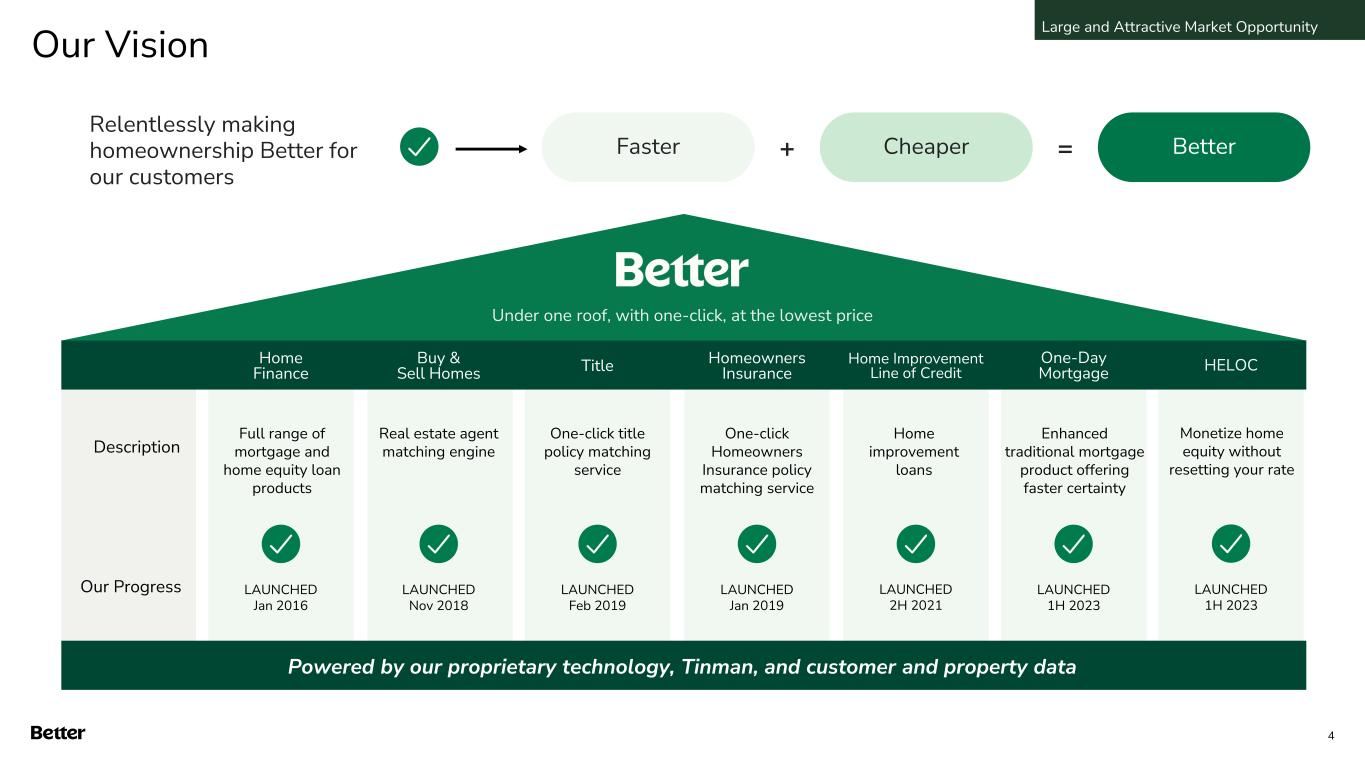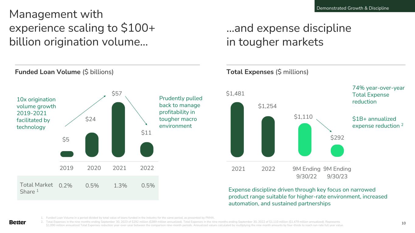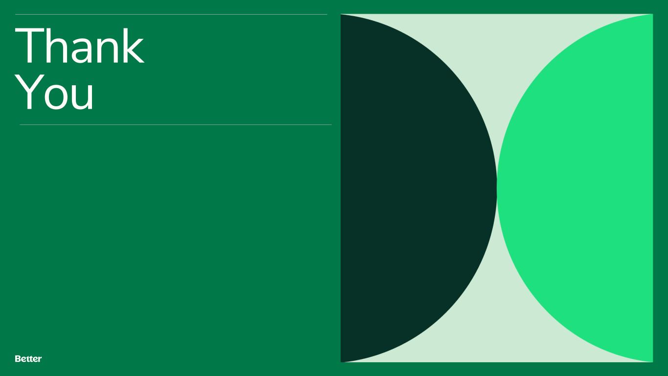 Disclaimer This document and any related oral presentation do not constitute an offer or invitation to subscribe for, purchase or otherwise acquire any securities or other instruments of Better Home & Finance Holding Company ("Better" or the "Company") and nothing contained herein or its presentation shall form the basis of any offer, contract or commitment whatsoever. The distribution of this document and any related oral presentation in certain jurisdictions may be restricted by law and persons into whose possession this document or any related oral presentation comes should inform themselves about, and observe, any such restriction. Any failure to comply with these restrictions may constitute a violation of the laws of any such other jurisdiction Forward Looking Statements This presentation contains certain forward-looking statements within the meaning of federal securities laws. Forward-looking statements are predictions, projections and other statements about future events that are based on current expectations and assumptions and, as a result, are subject to risks and uncertainties. Many factors could cause actual future events to differ materially from the forward-looking statements in this communication. Such factors can be found in the Registration Statement on Form S-1 filed with the SEC by the Company on October 12, 2023, as well as the Company’s most recent quarterly report on Form 10-Q and current reports on Form 8-K, which are available, free of charge, at the SEC’s website at www.sec.gov. New risks and uncertainties arise from time to time, and it is impossible for Better to predict these events or how they may affect us. You are cautioned not to place undue reliance upon any forward-looking statements, which speak only as of the date made, and Better undertakes no obligation, except as required by law, to update or revise the forward-looking statements, whether as a result of new information, changes in expectations, future events or otherwise. Use of Non-GAAP Measures and Other Financial Metrics This presentation includes certain financial measures not presented in accordance with generally accepted accounting principles (“GAAP”) including, Adjusted EBITDA, Adjusted Net Income (Loss), Revenue excluding Better Cash Offer program revenue, Total Expenses excluding Better Cash Offer program, metrics derived therefrom and other key metrics. We calculate Adjusted Net Income (Loss) as net income (loss) adjusted for the impact of stock-based compensation expense, change in the fair value of warrants, change in the fair value of bifurcated derivative, interest on Pre-Closing Bridge Notes, and other non- recurring or non-core operational expenses. We calculate Adjusted EBITDA as net income (loss) adjusted for the impact of stock-based compensation expense, change in the fair value of warrants, change in the fair value of bifurcated derivative, interest on Pre-Closing Bridge Notes, and other non-recurring or non-core operational expenses, as well as interest and amortization on non- funding debt (which includes interest on Convertible Notes), depreciation and amortization expense, and income tax expense. Revenue excluding Cash Offer program revenue is determined by excluding Cash offer program revenue from Total net revenues. Total Expenses excluding Cash Offer program expenses is determined by excluding Cash offer program expenses from Total expenses. These non-GAAP financial measures should not be considered in isolation and are not intended to be a substitute for any GAAP financial measures. These non- GAAP measures provide supplemental information that we believe helps investors better understand our business, our business model and how we analyze our performance. We also believe these non-GAAP financial measures improve investors’ and analysts’ ability to compare our results with those of our competitors and other similarly situated companies, which commonly disclose similar performance measures. However, our calculation of Adjusted EBITDA and Adjusted Net Income (Loss) may not be comparable to similarly titled performance measures presented by other companies. Further, although we use these non-GAAP measures to assess the financial performance of our business, these measures exclude certain substantial costs related to our business, and investors are cautioned not to use such measures as a substitute for financial results prepared according to GAAP. Non-GAAP financial measures have limitations in their usefulness to investors because they have no standardized meaning prescribed by GAAP and are not prepared under any comprehensive set of accounting rules or principles. As a result, non- GAAP financial measures should be viewed as supplementing, and not as an alternative or substitute for, our financial results prepared and presented in accordance with GAAP. For a reconciliation of non-GAAP measures used in this presentation to the closest comparable GAAP measures, see the Reconciliation of Non-GAAP Measures section of this presentation. Key Metrics In this presentation, we refer to the following key metrics: Funded Loan Volume is the aggregate dollar amount of loans funded based on the principal amount of the loan at funding. Purchase Volume is the ratio (expressed as a percentage) of the aggregate dollar amount of purchase loans funded in a given period based on the principal amount of the loan at funding to Funded Loan Volume. D2C Volume is the ratio (expressed as a percentage) of the aggregate dollar amount of loans funded in a given period based on the principal amount of the loan at funding that have been generated from direct interactions with customers using all marketing channels other than our B2B partner relationships to Funded Loan Volume. Total Loans represents the total number of loans funded in a given period, including purchase loans, refinance loans and HELOC loans, and HELOC Loans is the ratio (expressed as a percentage) of Total Loans that were HE