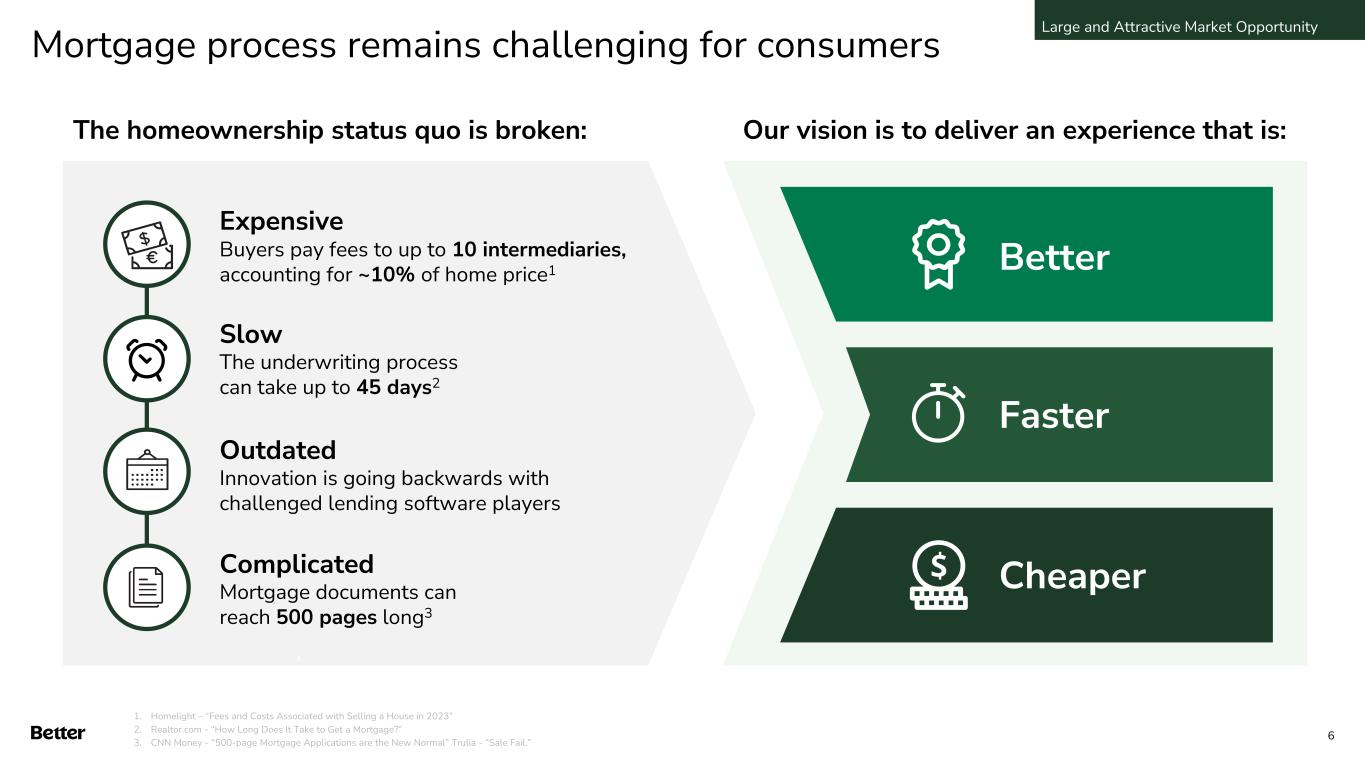 Homeownership market is enormous $11 Trillion $13 Trillion $17+ Trillion ~4T2 Financial Network ~2T Insurance (Title & Home) ~33tn U.S. Housing Market ~11tn1 U.S. Mortgage Core Expansion $ 7 Consumer Financial Network $2.5T4 U.S. Home Finance $8T5 International Home Finance $2T6 Home Services Ecosystem Cumulative market size 1. National Association of Home Builders – Housing’s Contribution to Gross Domestic Product; 2. Statista Research, ‘Number of new house sales in the United States from 2000 to 2022, by financing type’; 3. Census.gov – The Wealth of Households 2021 (including equity in own home, rental properties, and other real estate); 4. MBA average annual mortgage origination volume, 2017-2026E; 5. Allied Market Research – Mortgage Lending Market Research, 2031; 6. $1.3T of home rental (IBIS), $600B of home improvement (Farnsworth Group) $13bn of US appraisal and inspection (IBIS), $21bn of moving and storage (IBIS); 7. $1.4 trillion US insurance industry net premiums (Insurance Information Institute), $1.6 trillion student loan debt (Forbes), $1 trillion credit card debt (LendingTree) • Annual spend within the housing market accounted for on average $3 trillion per year, 15-18% of US GDP since 20011 • Since 2013, over 90% of new homes were purchased with a mortgage2 • For average households, home equity totals over 35% of net worth3 • In general, all mortgage transactions require at least one insurance product Large and Attractive Market Opportunity 5