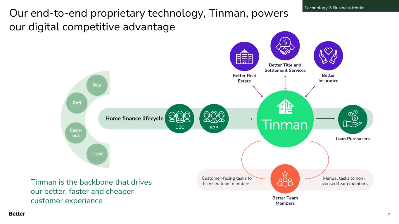 Mortgage process remains challenging for consumers 1. Homelight – “Fees and Costs Associated with Selling a House in 2023” 2. Realtor.com - “How Long Does It Take to Get a Mortgage?” 3. CNN Money - “500-page Mortgage Applications are the New Normal” Trulia - “Sale Fail.” Large and Attractive Market Opportunity The homeownership status quo is broken: Our vision is to deliver an experience that is: Expensive Buyers pay fees to up to 10 intermediaries, accounting for ~10% of home price1 Slow The underwriting process can take up to 45 days2 Outdated Innovation is going backwards with challenged lending software players Complicated Mortgage documents can reach 500 pages long3 Better Faster Cheaper 6