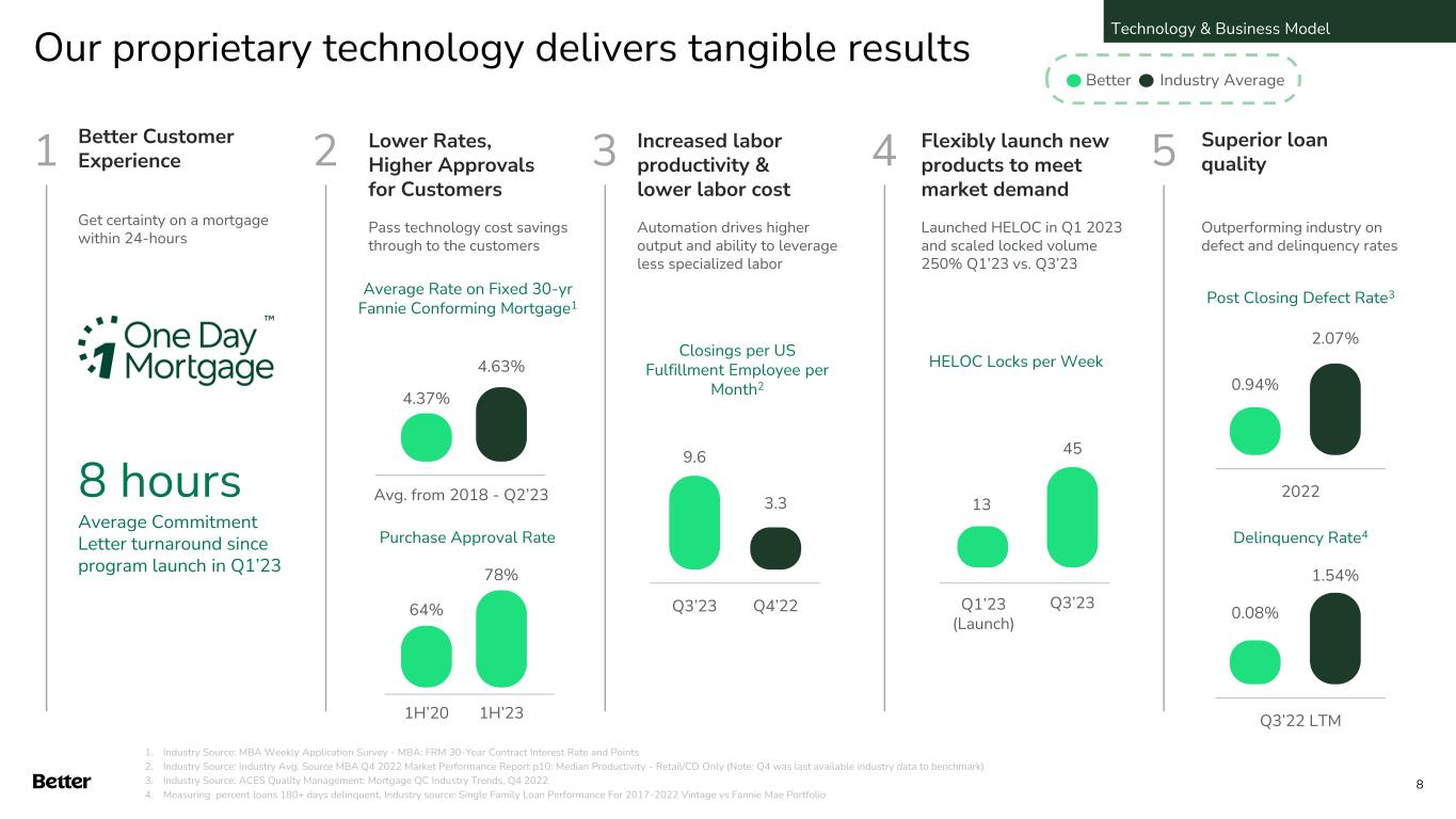 Our end-to-end proprietary technology, Tinman, powers our digital competitive advantage Home finance lifecycle Better Real Estate Better Title and Settlement Services Better Insurance Manual tasks to non- licensed team members Customer-facing tasks to licensed team members D2C B2B Better Team Members Loan Purchasers Buy Refi Cash- out HELOC Tinman is the backbone that drives our better, faster and cheaper customer experience Technology & Business Model 7