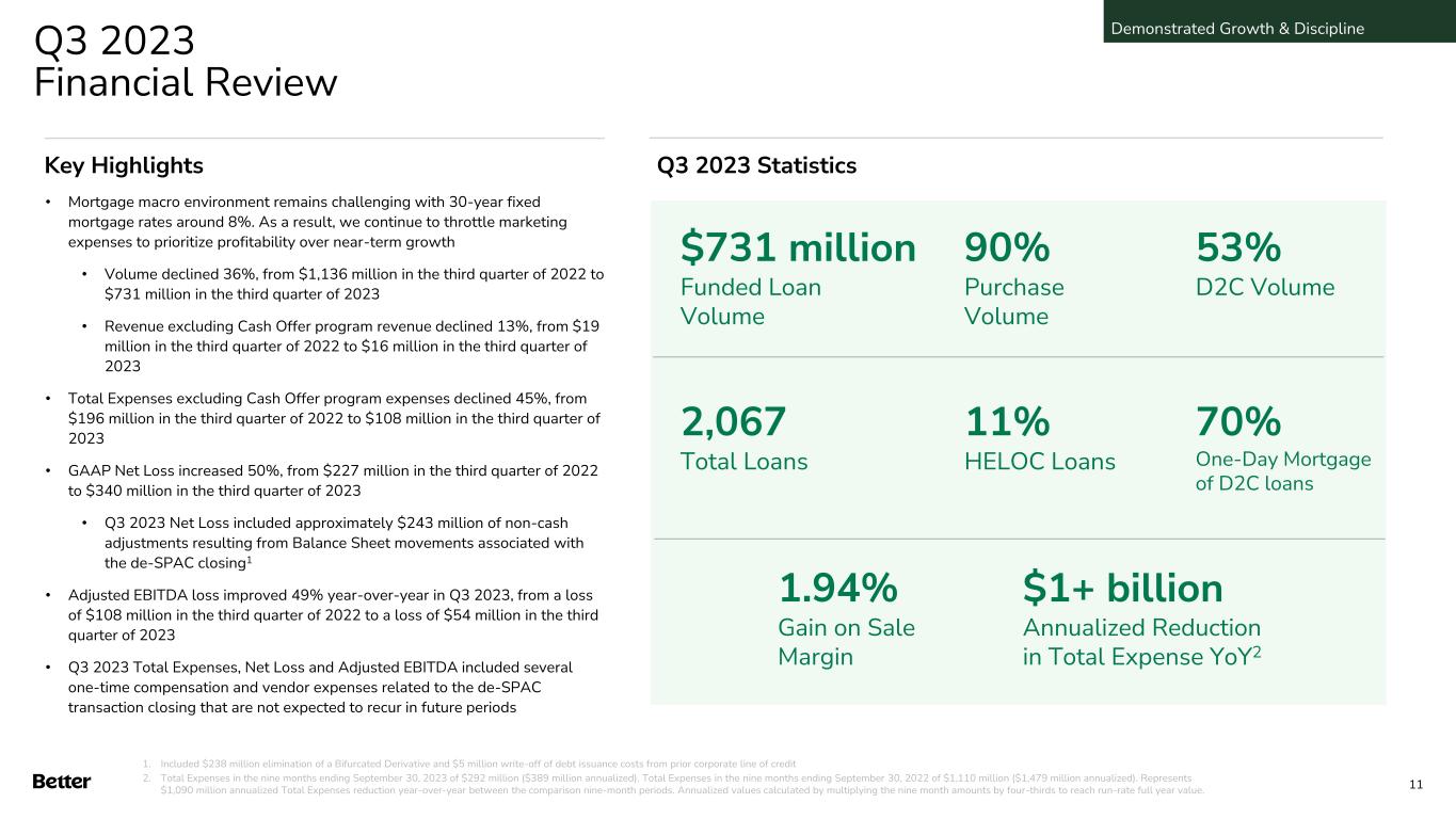 2021 $1,481 2022 $1,254 Total Expenses ($ millions) 9M Ending 9/30/23 $292 9M Ending 9/30/22 $1,110 74% year-over-year Total Expense reduction $1B+ annualized expense reduction 2 Expense discipline driven through key focus on narrowed product range suitable for higher-rate environment, increased automation, and sustained partnerships …and expense discipline in tougher markets Management with experience scaling to $100+ billion origination volume… Total Market Share 1 0.2% 0.5% 1.3% 0.5% Funded Loan Volume ($ billions) 2019 $5 2020 $24 2021 $57 2022 $11 10x origination volume growth 2019-2021 facilitated by technology Prudently pulled back to manage profitability in tougher macro environment 1. Funded Loan Volume in a period divided by total value of loans funded in the industry for the same period, as presented by FNMA. 2. Total Expenses in the nine months ending September 30, 2023 of $292 million ($389 million annualized). Total Expenses in the nine months ending September 30, 2022 of $1,110 million ($1,479 million annualized). Represents $1,090 million annualized Total Expenses reduction year-over-year between the comparison nine-month periods. Annualized values calculated by multiplying the nine month amounts by four-thirds to reach run-rate full year value. Demonstrated Growth & Discipline 10