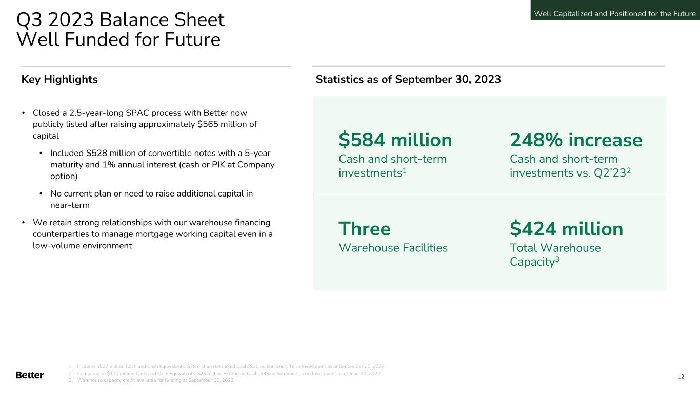 Q3 2023 Financial Review • Mortgage macro environment remains challenging with 30-year fixed mortgage rates around 8%. As a result, we continue to throttle marketing expenses to prioritize profitability over near-term growth • Volume declined 36%, from $1,136 million in the third quarter of 2022 to $731 million in the third quarter of 2023 • Revenue excluding Cash Offer program revenue declined 13%, from $19 million in the third quarter of 2022 to $16 million in the third quarter of 2023 • Total Expenses excluding Cash Offer program expenses declined 45%, from $196 million in the third quarter of 2022 to $108 million in the third quarter of 2023 • GAAP Net Loss increased 50%, from $227 million in the third quarter of 2022 to $340 million in the third quarter of 2023 • Q3 2023 Net Loss included approximately $243 million of non-cash adjustments resulting from Balance Sheet movements associated with the de-SPAC closing1 • Adjusted EBITDA loss improved 49% year-over-year in Q3 2023, from a loss of $108 million in the third quarter of 2022 to a loss of $54 million in the third quarter of 2023 • Q3 2023 Total Expenses, Net Loss and Adjusted EBITDA included several one-time compensation and vendor expenses related to the de-SPAC transaction closing that are not expected to recur in future periods $731 million Funded Loan Volume Key Highlights Q3 2023 Statistics 90% Purchase Volume 53% D2C Volume 70% One-Day Mortgage of D2C loans 2,067 Total Loans 11% HELOC Loans 1.94% Gain on Sale Margin $1+ billion Annualized Reduction in Total Expense YoY2 1. Included $238 million elimination of a Bifurcated Derivative and $5 million write-off of debt issuance costs from prior corporate line of credit 2. Total Expenses in the nine months ending September 30, 2023 of $292 million ($389 million annualized). Total Expenses in the nine months ending September 30, 2022 of $1,110 million ($1,479 million annualized). Represents $1,090 million annualized Total Expenses reduction year-over-year between the comparison nine-month periods. Annualized values calculated by multiplying the nine month amounts by four-thirds to reach run-rate full year value. Demonstrated Growth & Discipline 11