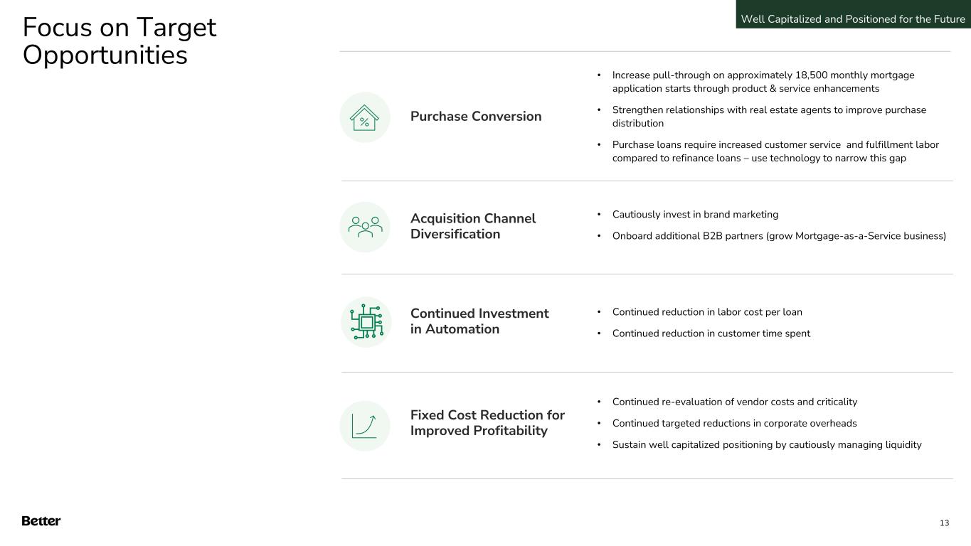 1. Includes $527 million Cash and Cash Equivalents, $28 million Restricted Cash, $30 million Short Term Investment as of September 30, 2023 2. Compared to $110 million Cash and Cash Equivalents, $25 million Restricted Cash, $33 million Short Term Investment as of June 30, 2022 3. Warehouse capacity credit available for funding at September 30, 2023 Q3 2023 Balance Sheet Well Funded for Future • Closed a 2.5-year-long SPAC process with Better now publicly listed after raising approximately $565 million of capital • Included $528 million of convertible notes with a 5-year maturity and 1% annual interest (cash or PIK at Company option) • No current plan or need to raise additional capital in near-term • We retain strong relationships with our warehouse financing counterparties to manage mortgage working capital even in a low-volume environment Key Highlights Statistics as of September 30, 2023 $584 million Cash and short-term investments1 248% increase Cash and short-term investments vs. Q2’232 Three Warehouse Facilities $424 million Total Warehouse Capacity3 Well Capitalized and Positioned for the Future 12