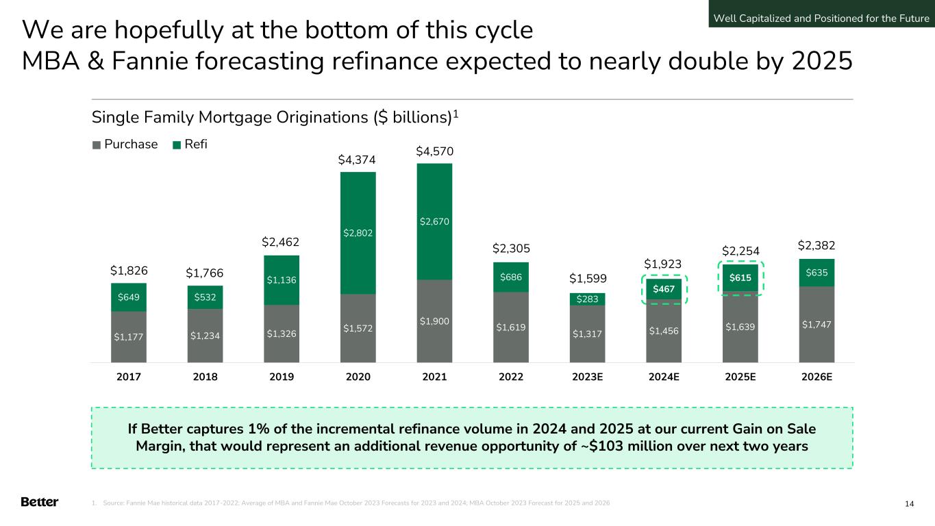 Focus on Target Opportunities Purchase Conversion • Increase pull-through on approximately 18,500 monthly mortgage application starts through product & service enhancements • Strengthen relationships with real estate agents to improve purchase distribution • Purchase loans require increased customer service and fulfillment labor compared to refinance loans – use technology to narrow this gap Acquisition Channel Diversification Continued Investment in Automation Fixed Cost Reduction for Improved Profitability • Cautiously invest in brand marketing • Onboard additional B2B partners (grow Mortgage-as-a-Service business) • Continued reduction in labor cost per loan • Continued reduction in customer time spent • Continued re-evaluation of vendor costs and criticality • Continued targeted reductions in corporate overheads • Sustain well capitalized positioning by cautiously managing liquidity Well Capitalized and Positioned for the Future 13