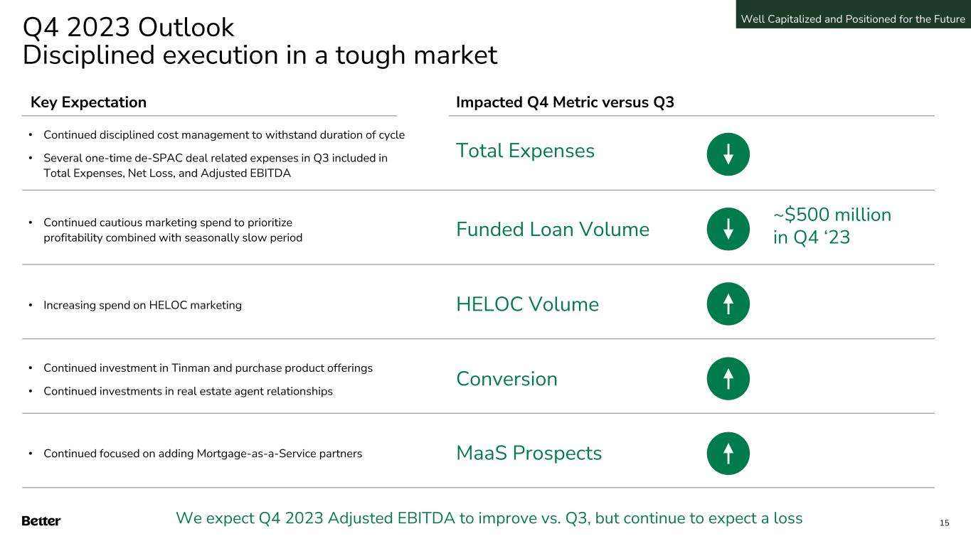 We are hopefully at the bottom of this cycle MBA & Fannie forecasting refinance expected to nearly double by 2025 If Better captures 1% of the incremental refinance volume in 2024 and 2025 at our current Gain on Sale Margin, that would represent an additional revenue opportunity of ~$103 million over next two years $1,177 $1,234 $1,326 $1,572 $1,900 $1,619 $1,317 $1,456 $1,639 $1,747 $649 $532 $1,136 $2,802 $2,670 $686 $283 $467 $615 $635 2017 2018 2019 2020 2021 2022 2023E 2024E 2025E 2026E Purchase Refi $1,826 $1,766 $2,462 $4,374 $4,570 $2,305 $1,599 $1,923 $2,254 $2,382 Single Family Mortgage Originations ($ billions)1 Well Capitalized and Positioned for the Future 1. Source: Fannie Mae historical data 2017-2022; Average of MBA and Fannie Mae October 2023 Forecasts for 2023 and 2024; MBA October 2023 Forecast for 2025 and 2026 14