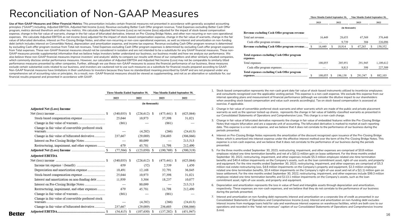 Reconciliation of Non-GAAP Measures 16 1. Stock-based compensation represents the non-cash grant date fair value of stock-based instruments utilized to incentivize employees and consultants recognized over the applicable vesting period. This expense is a non-cash expense. We exclude this expense from our internal operating plans and measurement of financial performance (although we consider the dilutive impact to our shareholders when awarding stock-based compensation and value such awards accordingly). Tax on stock-based compensation is assessed at exercise, if applicable. 2. Change in fair value of convertible preferred stock warrants and other warrants which are made of the public and private placement warrants as well as the sponsor locked-up shares, represents the change in fair value of liability-classified warrants as presented in our Consolidated Statements of Operations and Comprehensive Loss. This charge is a non-cash charge. 3. Change in fair value of bifurcated derivative represents the change in fair value of embedded features within the Pre-Closing Bridge Notes that require bifurcation and are a separate unit of accounting. The bifurcated derivative is marked to market at each reporting date. This expense is a non-cash expense, and we believe that it does not correlate to the performance of our business during the periods presented. 4. Interest on Pre-Closing Bridge Notes represents the amortization of the discount recognized upon issuance of the Pre-Closing Bridge Notes which is amortized into interest expense under the effective interest method over the term of the Pre-Closing Bridge Notes. This expense is a non-cash expense, and we believe that it does not correlate to the performance of our business during the periods presented. 5. For the three months ended September 30, 2023, restructuring, impairment, and other expenses are comprised of $0.8 million employee related one-time termination benefits and net of a $(0.1) million gain on lease settlement. For the three months ended September 30, 2022, restructuring, impairment, and other expenses include $5.3 million employee related one-time termination benefits and $40.4 million impairments on the Company’s assets, such as the loan commitment asset, right-of-use assets, and property and equipment. For the nine months ended September 30, 2023, restructuring, impairment, and other expenses are comprised of $5.3 million real estate restructuring loss, $4.8 million impairments on the Company’s property and equipment, $2.3 million employee related one-time termination benefits, $0.4 million impairments on the Company’s right-of-use asset and net of a $(1.1) million gain on lease settlement. For the nine months ended September 30, 2022, restructuring, impairment, and other expenses include $99.3 million employee related one-time termination benefits and $113.1 million impairments on the Company’s assets, such as the loan commitment asset, right-of-use assets, and property and equipment. 6. Depreciation and amortization represents the loss in value of fixed and intangible assets through depreciation and amortization, respectively. These expenses are non-cash expenses, and we believe that they do not correlate to the performance of our business during the periods presented. 7. Interest and amortization on non-funding debt represents interest and amortization on a corporate line of credit as presented in our Consolidated Statements of Operations and Comprehensive Income (Loss). Interest and amortization on non-funding debt excludes interest income from mortgage loans held for sale and warehouse interest expense on warehouse facilities, which are both core to our operations and recorded in the “total net revenues” caption of our Consolidated Statements of Operations and Comprehensive Income (Loss). Use of Non-GAAP Measures and Other Financial Metrics: This presentation includes certain financial measures not presented in accordance with generally accepted accounting principles (“GAAP”) including, Adjusted EBITDA, Adjusted Net Income (Loss), Revenue excluding Better Cash Offer program revenue, Total Expenses excluding Better Cash Offer program, metrics derived therefrom and other key metrics. We calculate Adjusted Net Income (Loss) as net income (loss) adjusted for the impact of stock-based compensation expense, change in the fair value of warrants, change in the fair value of bifurcated derivative, interest on Pre-Closing Bridge Notes, and other non-recurring or non-core operational expenses. We calculate Adjusted EBITDA as net income (loss) adjusted for the impact of stock-based compensation expense, change in the fair value of warrants, change in the fair value of bifurcated derivative, interest on Pre-Closing Bridge Notes, and other non-recurring or non-core operational expenses, as well as interest and amortization on non-funding debt (which includes interest on Convertible Notes), depreciation and amortization expense, and income tax expense. Revenue excluding Cash Offer program revenue is determined by excluding Cash offer program revenue from Total net revenues. Total Expenses excluding Cash Offer program expenses is determined by excluding Cash offer program expenses from Total expenses. These non-GAAP financial measures should not be considered in isolation and are not intended to be a substitute for any GAAP financial measures. These non- GAAP measures provide supplemental information that we believe helps investors better understand our business, our business model and how we analyze our performance. We also believe these non-GAAP financial measures improve investors’ and analysts’ ability to compare our results with those of our competitors and other similarly situated companies, which commonly disclose similar performance measures. However, our calculation of Adjusted EBITDA and Adjusted Net Income (Loss) may not be comparable to similarly titled performance measures presented by other companies. Fu