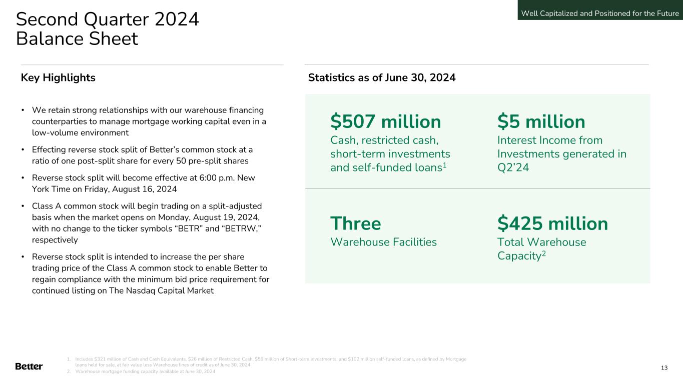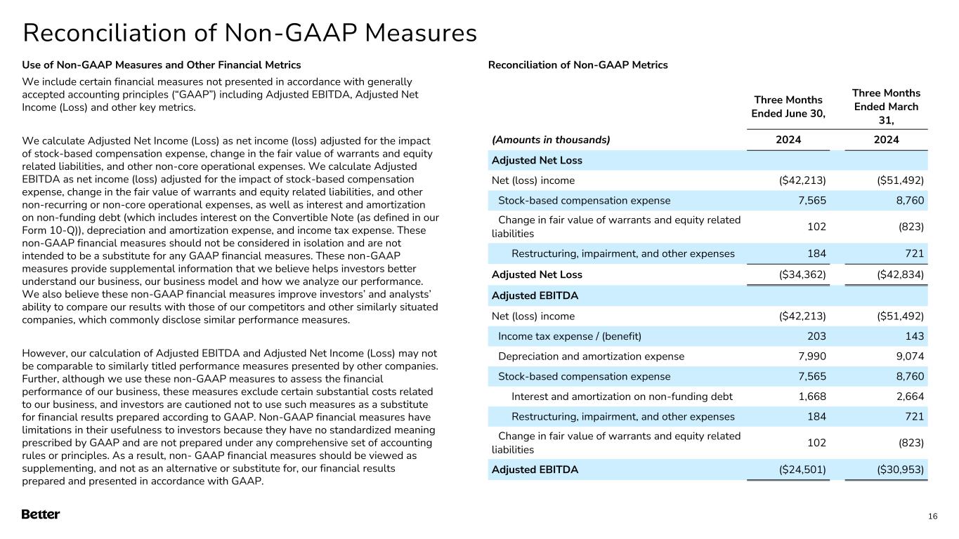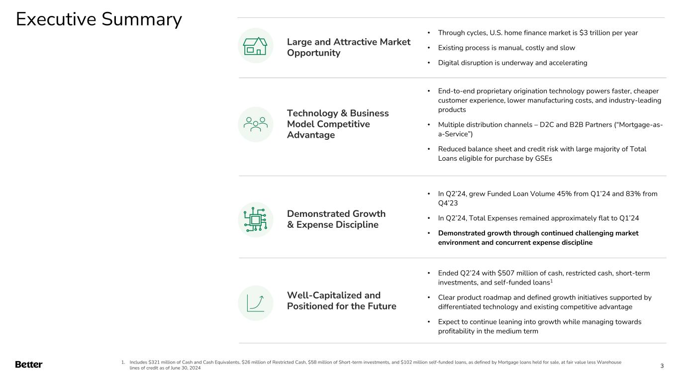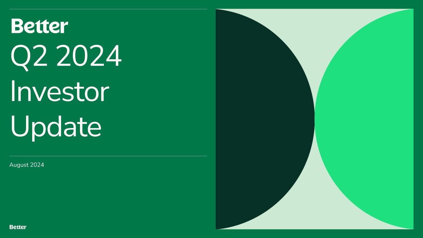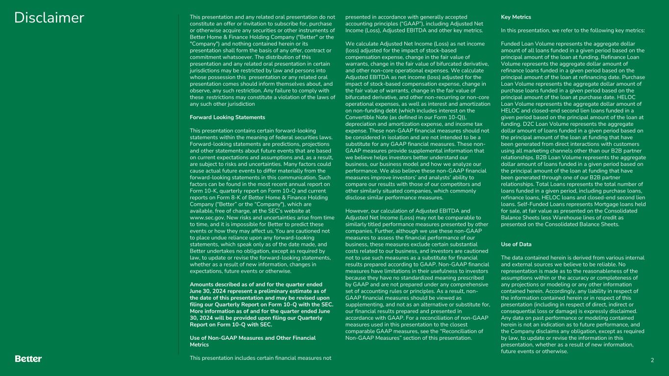 Disclaimer This presentation and any related oral presentation do not constitute an offer or invitation to subscribe for, purchase or otherwise acquire any securities or other instruments of Better Home & Finance Holding Company ("Better" or the "Company") and nothing contained herein or its presentation shall form the basis of any offer, contract or commitment whatsoever. The distribution of this presentation and any related oral presentation in certain jurisdictions may be restricted by law and persons into whose possession this presentation or any related oral presentation comes should inform themselves about, and observe, any such restriction. Any failure to comply with these restrictions may constitute a violation of the laws of any such other jurisdiction Forward Looking Statements This presentation contains certain forward-looking statements within the meaning of federal securities laws. Forward-looking statements are predictions, projections and other statements about future events that are based on current expectations and assumptions and, as a result, are subject to risks and uncertainties. Many factors could cause actual future events to differ materially from the forward-looking statements in this communication. Such factors can be found in the most recent annual report on Form 10-K, quarterly report on Form 10-Q and current reports on Form 8-K of Better Home & Finance Holding Company (“Better” or the “Company"), which are available, free of charge, at the SEC’s website at www.sec.gov. New risks and uncertainties arise from time to time, and it is impossible for Better to predict these events or how they may affect us. You are cautioned not to place undue reliance upon any forward-looking statements, which speak only as of the date made, and Better undertakes no obligation, except as required by law, to update or revise the forward-looking statements, whether as a result of new information, changes in expectations, future events or otherwise. Amounts described as of and for the quarter ended June 30, 2024 represent a preliminary estimate as of the date of this presentation and may be revised upon filing our Quarterly Report on Form 10-Q with the SEC. More information as of and for the quarter ended June 30, 2024 will be provided upon filing our Quarterly Report on Form 10-Q with SEC. Use of Non-GAAP Measures and Other Financial Metrics This presentation includes certain financial measures not presented in accordance with generally accepted accounting principles (“GAAP”), including Adjusted Net Income (Loss), Adjusted EBITDA and other key metrics. We calculate Adjusted Net Income (Loss) as net income (loss) adjusted for the impact of stock-based compensation expense, change in the fair value of warrants, change in the fair value of bifurcated derivative, and other non-core operational expenses. We calculate Adjusted EBITDA as net income (loss) adjusted for the impact of stock-based compensation expense, change in the fair value of warrants, change in the fair value of bifurcated derivative, and other non-recurring or non-core operational expenses, as well as interest and amortization on non-funding debt (which includes interest on the Convertible Note (as defined in our Form 10-Q)), depreciation and amortization expense, and income tax expense. These non-GAAP financial measures should not be considered in isolation and are not intended to be a substitute for any GAAP financial measures. These non- GAAP measures provide supplemental information that we believe helps investors better understand our business, our business model and how we analyze our performance. We also believe these non-GAAP financial measures improve investors’ and analysts’ ability to compare our results with those of our competitors and other similarly situated companies, which commonly disclose similar performance measures. However, our calculation of Adjusted EBITDA and Adjusted Net Income (Loss) may not be comparable to similarly titled performance measures presented by other companies. Further, although we use these non-GAAP measures to assess the financial performance of our business, these measures exclude certain substantial costs related to our business, and investors are cautioned not to use such measures as a substitute for financial results prepared according to GAAP. Non-GAAP financial measures have limitations in their usefulness to investors because they have no standardized meaning prescribed by GAAP and are not prepared under any comprehensive set of accounting rules or principles. As a result, non- GAAP financial measures should be viewed as supplementing, and not as an alternative or substitute for, our financial results prepared and presented in accordance with GAAP. For a reconciliation of non-GAAP measures used in this presentation to the closest comparable GAAP measures, see the “Reconciliation of Non-GAAP Measures” section of this presentation. Key Metrics In this presentation, we refer to the following key metrics: Funded Loan Volume represents the aggregate dollar amount of all loans funded in a given period based on the principal amount of the loan at funding. Refinance Loan Volume represents the aggregate dollar amount of refinance loans funded in a given period based on the principal amount of the loan at refinancing date. Purchase Loan Volume represents the aggregate dollar amount of purchase loans funded in a given period based on the principal amount of the loan at purchase date. HELOC Loan Volume represents the aggregate dollar amount of HELOC and closed-end second lien loans funded in a given period based on the principal amount of the loan at funding. D2C Loan Volume represents the aggregate dollar amount of loans funded in a given period based on the principal amount of the loan at funding that have been generated from direct interactions with customers using all marketing channels other than our B2B partner relationships. B2B Loan Volume represents the 