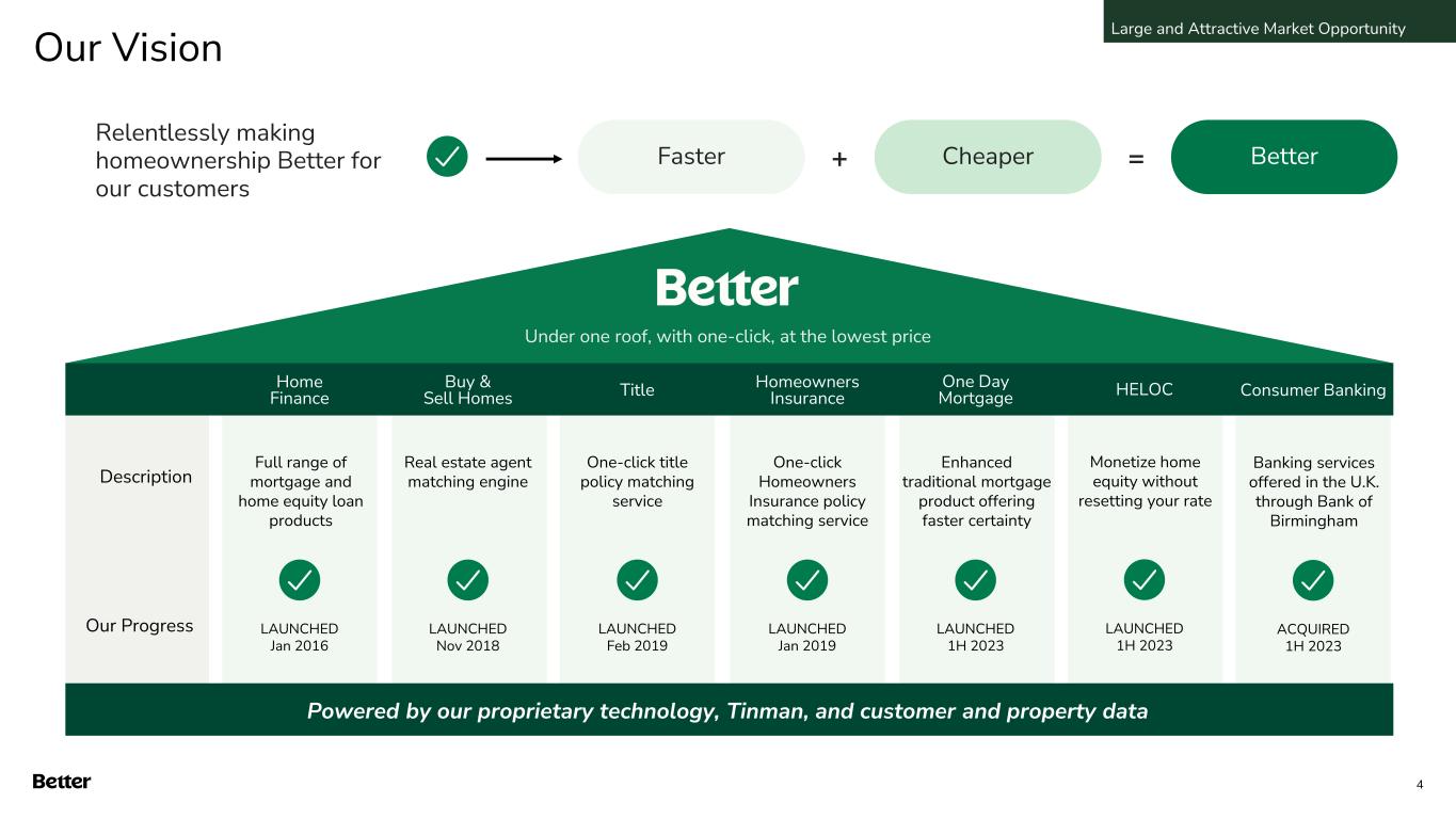 Executive Summary Large and Attractive Market Opportunity • Through cycles, U.S. home finance market is $3 trillion per year • Existing process is manual, costly and slow • Digital disruption is underway and accelerating Technology & Business Model Competitive Advantage Demonstrated Growth & Expense Discipline Well-Capitalized and Positioned for the Future • End-to-end proprietary origination technology powers faster, cheaper customer experience, lower manufacturing costs, and industry-leading products • Multiple distribution channels – D2C and B2B Partners (“Mortgage-as- a-Service”) • Reduced balance sheet and credit risk with large majority of Total Loans eligible for purchase by GSEs • In Q2’24, grew Funded Loan Volume 45% from Q1’24 and 83% from Q4’23 • In Q2’24, Total Expenses remained approximately flat to Q1’24 • Demonstrated growth through continued challenging market environment and concurrent expense discipline • Ended Q2’24 with $507 million of cash, restricted cash, short-term investments, and self-funded loans1 • Clear product roadmap and defined growth initiatives supported by differentiated technology and existing competitive advantage • Expect to continue leaning into growth while managing towards profitability in the medium term 1. Includes $321 million of Cash and Cash Equivalents, $26 million of Restricted Cash, $58 million of Short-term investments, and $102 million self-funded loans, as defined by Mortgage loans held for sale, at fair value less Warehouse lines of credit as of June 30, 2024 3