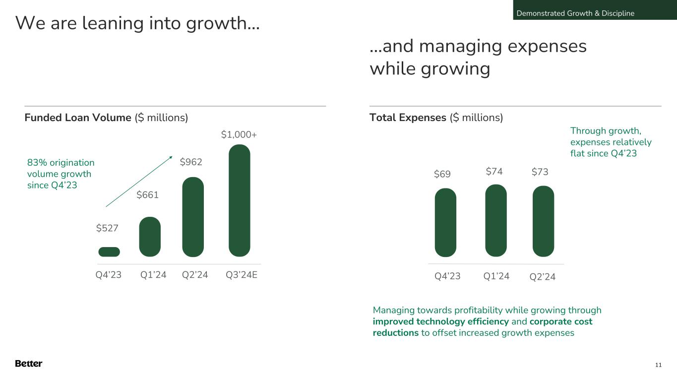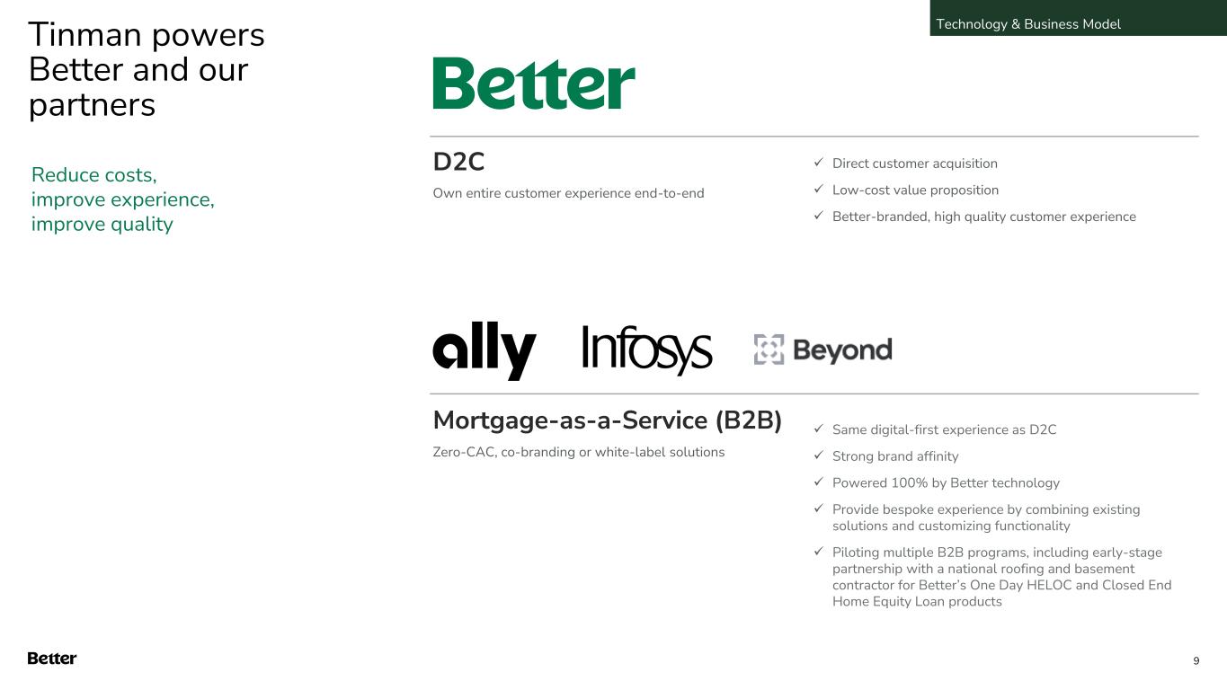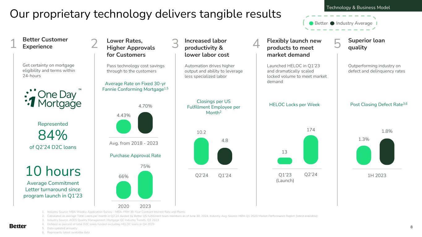 Our proprietary technology delivers tangible results Better Customer Experience Get certainty on mortgage eligibility and terms within 24-hours Lower Rates, Higher Approvals for Customers Pass technology cost savings through to the customers Increased labor productivity & lower labor cost Automation drives higher output and ability to leverage less specialized labor Flexibly launch new products to meet market demand Launched HELOC in Q1’23 and dramatically scaled locked volume to meet market demand 1 Superior loan quality Outperforming industry on defect and delinquency rates 1H 2023 1.3% 1.8% Post Closing Defect Rate3,6 2020 2023 Purchase Approval Rate 66% 75%10 hours Average Commitment Letter turnaround since program launch in Q1’23 Avg. from 2018 - 2023 4.43% 4.70% Average Rate on Fixed 30-yr Fannie Conforming Mortgage1,5 Closings per US Fulfillment Employee per Month2 HELOC Locks per Week Q1’23 (Launch) 13 Q2’24 174 1. Industry Source: MBA Weekly Application Survey - MBA: FRM 30-Year Contract Interest Rate and Points 2. Calculated as average Total Loans per month in Q2’24 divided by Better US fulfillment team members as of June 30, 2024. Industry Avg. Source: MBA Q1 2023 Market Performance Report (latest available) 3. Industry Source: ACES Quality Management: Mortgage QC Industry Trends, Q2 2023 4. Defined as percent of total D2C loans funded excluding HELOC loans in Q4 2023 5. Data updated annually 6. Represents latest available data Better Industry Average Technology & Business Model 10.2 4.8 Q2’24 2 3 4 5 8 Q1’24 Represented 84% of Q2’24 D2C loans