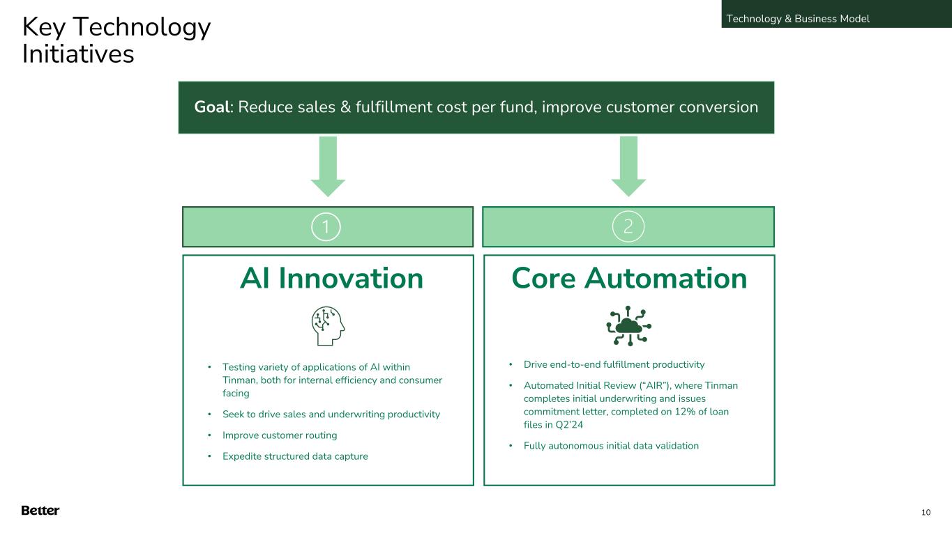 Tinman powers Better and our partners D2C Own entire customer experience end-to-end ✓ Direct customer acquisition ✓ Low-cost value proposition ✓ Better-branded, high quality customer experience Mortgage-as-a-Service (B2B) Zero-CAC, co-branding or white-label solutions ✓ Same digital-first experience as D2C ✓ Strong brand affinity ✓ Powered 100% by Better technology ✓ Provide bespoke experience by combining existing solutions and customizing functionality ✓ Piloting multiple B2B programs, including early-stage partnership with a national roofing and basement contractor for Better’s One Day HELOC and Closed End Home Equity Loan products Reduce costs, improve experience, improve quality Technology & Business Model 9