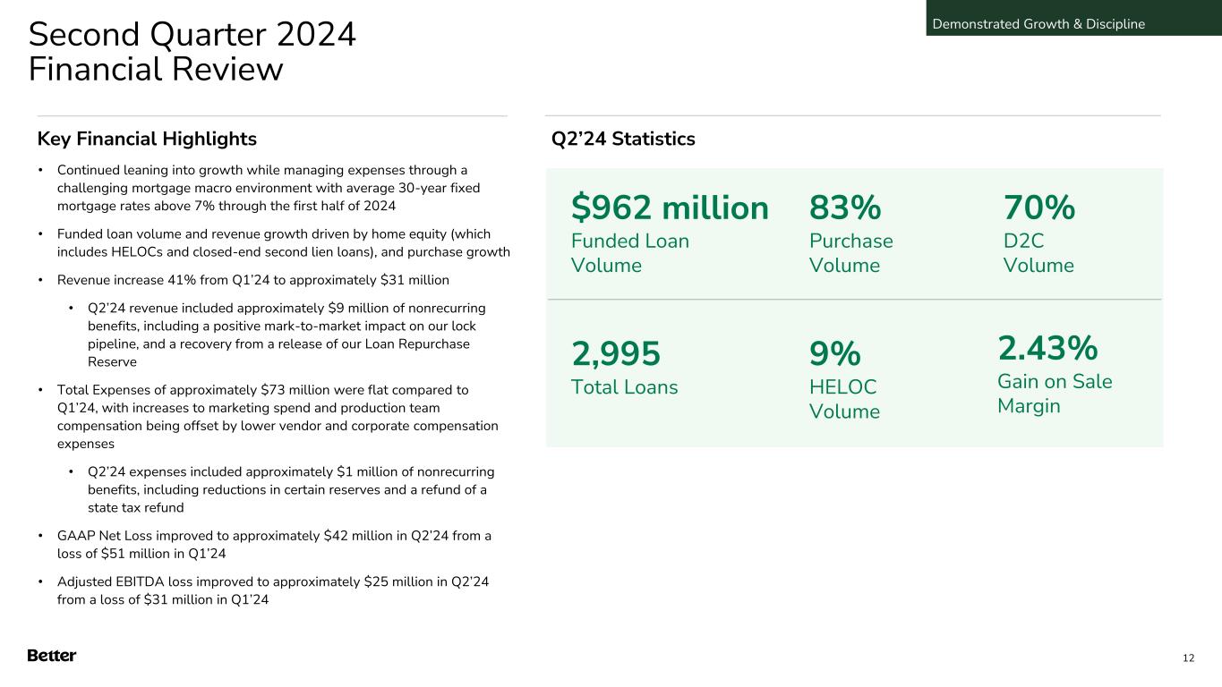 Second Quarter 2024 Financial Review • Continued leaning into growth while managing expenses through a challenging mortgage macro environment with average 30-year fixed mortgage rates above 7% through the first half of 2024 • Funded loan volume and revenue growth driven by home equity (which includes HELOCs and closed-end second lien loans), and purchase growth • Revenue increase 41% from Q1’24 to approximately $31 million • Q2’24 revenue included approximately $9 million of nonrecurring benefits, including a positive mark-to-market impact on our lock pipeline, and a recovery from a release of our Loan Repurchase Reserve • Total Expenses of approximately $73 million were flat compared to Q1’24, with increases to marketing spend and production team compensation being offset by lower vendor and corporate compensation expenses • Q2’24 expenses included approximately $1 million of nonrecurring benefits, including reductions in certain reserves and a refund of a state tax refund • GAAP Net Loss improved to approximately $42 million in Q2’24 from a loss of $51 million in Q1’24 • Adjusted EBITDA loss improved to approximately $25 million in Q2’24 from a loss of $31 million in Q1’24 $962 million Funded Loan Volume Key Financial Highlights Q2’24 Statistics 83% Purchase Volume 70% D2C Volume 2,995 Total Loans 9% HELOC Volume 2.43% Gain on Sale Margin Demonstrated Growth & Discipline 12
