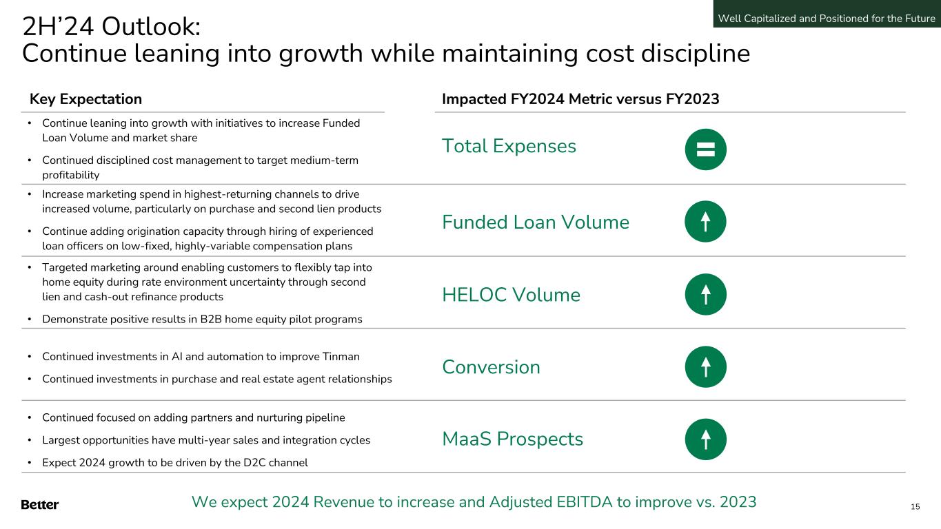 Focus on Target Opportunities Funnel Conversion • Increase pull-through on approximately 60,000 monthly mortgage application starts through product & service enhancements • Strengthen relationships with real estate agents to improve purchase distribution • Continue hiring experienced Loan Officers with demonstrated customer service track records on highly variable, low fixed compensation plans to align incentives with business outcomes Acquisition Channel Diversification Continued Investment in Automation Fixed Cost Reduction for Improved Profitability • Increase acquisition spend in performing channels, while cautiously investing in new channels and brand marketing • Onboard additional B2B partners, leaning into home equity demand • Persist through extended B2B sales cycles given our platform advantage and favorable medium-term trends of banks and others exiting mortgage • Investments made over the past three years enable operating leverage as we grow, where we expect to grow revenue faster than expenses • Continued investments in One Day Mortgage to make customer experience highly automated and best in class • Continued investments in AI to reduce labor cost and customer time spent • Continued re-evaluation of vendor costs and criticality • Continued targeted reductions in corporate overheads • Sustain well capitalized positioning by cautiously managing liquidity Well Capitalized and Positioned for the Future 14