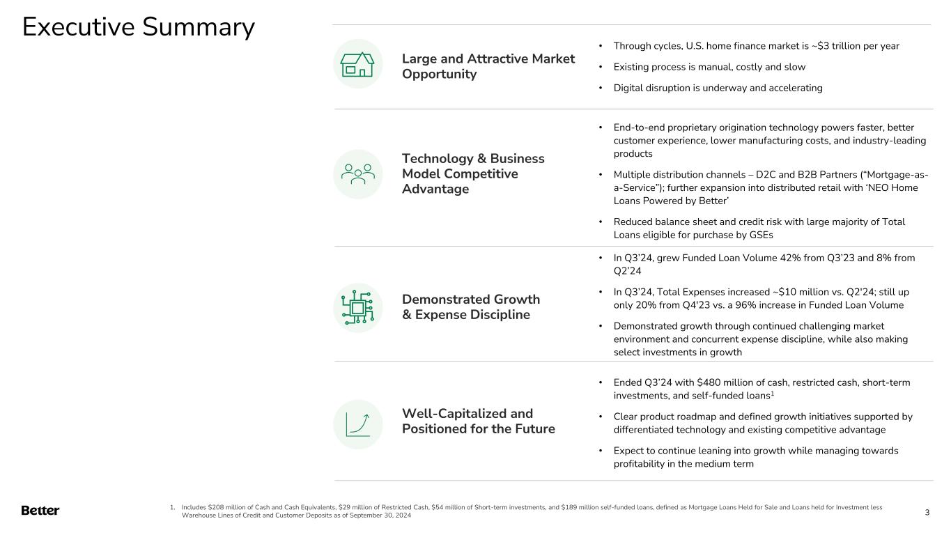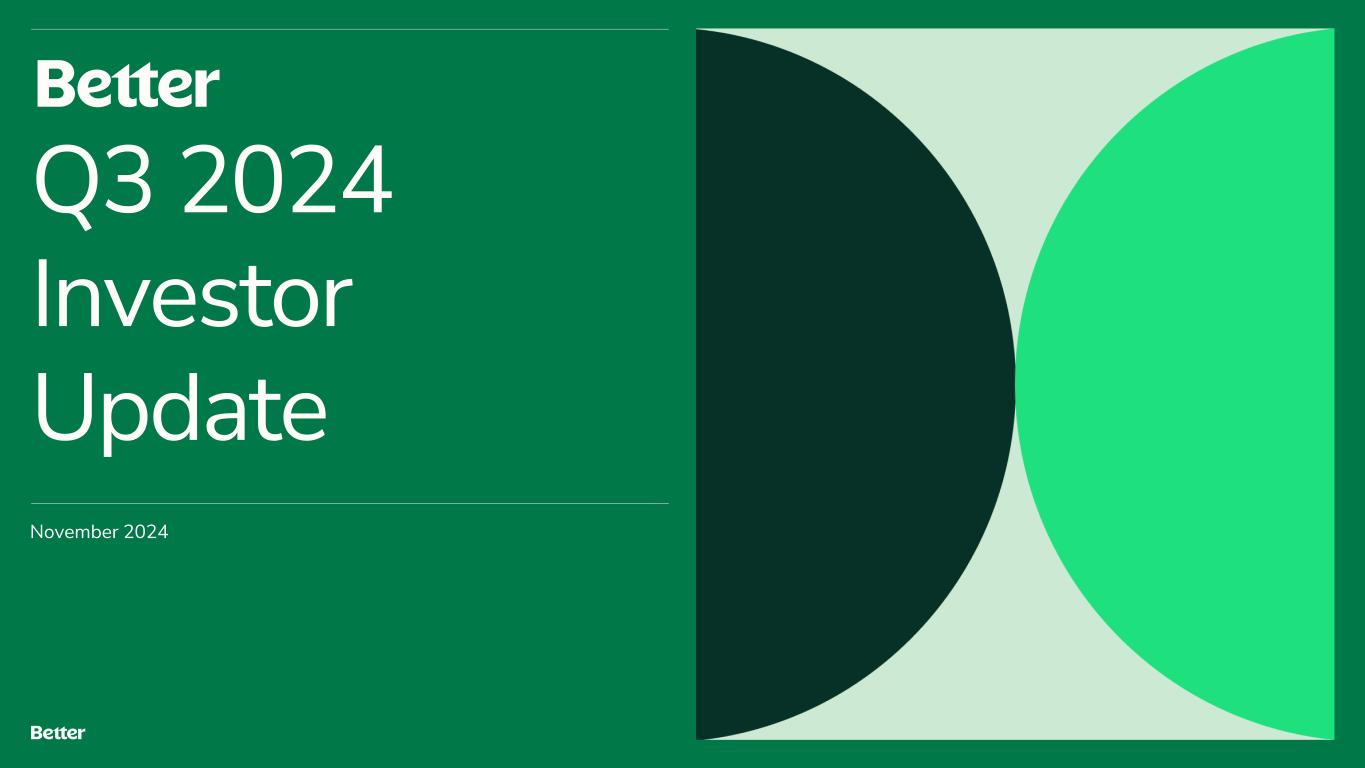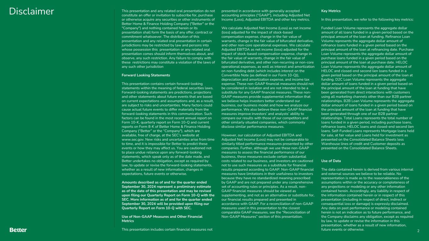 Disclaimer This presentation and any related oral presentation do not constitute an offer or invitation to subscribe for, purchase or otherwise acquire any securities or other instruments of Better Home & Finance Holding Company ("Better" or the "Company") and nothing contained herein or its presentation shall form the basis of any offer, contract or commitment whatsoever. The distribution of this presentation and any related oral presentation in certain jurisdictions may be restricted by law and persons into whose possession this presentation or any related oral presentation comes should inform themselves about, and observe, any such restriction. Any failure to comply with these restrictions may constitute a violation of the laws of any such other jurisdiction Forward Looking Statements This presentation contains certain forward-looking statements within the meaning of federal securities laws. Forward-looking statements are predictions, projections and other statements about future events that are based on current expectations and assumptions and, as a result, are subject to risks and uncertainties. Many factors could cause actual future events to differ materially from the forward-looking statements in this communication. Such factors can be found in the most recent annual report on Form 10-K, quarterly report on Form 10-Q and current reports on Form 8-K of Better Home & Finance Holding Company (“Better” or the “Company"), which are available, free of charge, at the SEC’s website at www.sec.gov. New risks and uncertainties arise from time to time, and it is impossible for Better to predict these events or how they may affect us. You are cautioned not to place undue reliance upon any forward-looking statements, which speak only as of the date made, and Better undertakes no obligation, except as required by law, to update or revise the forward-looking statements, whether as a result of new information, changes in expectations, future events or otherwise. Amounts described as of and for the quarter ended September 30, 2024 represent a preliminary estimate as of the date of this presentation and may be revised upon filing our Quarterly Report on Form 10-Q with the SEC. More information as of and for the quarter ended September 30, 2024 will be provided upon filing our Quarterly Report on Form 10-Q with SEC. Use of Non-GAAP Measures and Other Financial Metrics This presentation includes certain financial measures not presented in accordance with generally accepted accounting principles (“GAAP”), including Adjusted Net Income (Loss), Adjusted EBITDA and other key metrics. We calculate Adjusted Net Income (Loss) as net income (loss) adjusted for the impact of stock-based compensation expense, change in the fair value of warrants, change in the fair value of bifurcated derivative, and other non-core operational expenses. We calculate Adjusted EBITDA as net income (loss) adjusted for the impact of stock-based compensation expense, change in the fair value of warrants, change in the fair value of bifurcated derivative, and other non-recurring or non-core operational expenses, as well as interest and amortization on non-funding debt (which includes interest on the Convertible Note (as defined in our Form 10-Q)), depreciation and amortization expense, and income tax expense. These non-GAAP financial measures should not be considered in isolation and are not intended to be a substitute for any GAAP financial measures. These non- GAAP measures provide supplemental information that we believe helps investors better understand our business, our business model and how we analyze our performance. We also believe these non-GAAP financial measures improve investors’ and analysts’ ability to compare our results with those of our competitors and other similarly situated companies, which commonly disclose similar performance measures. However, our calculation of Adjusted EBITDA and Adjusted Net Income (Loss) may not be comparable to similarly titled performance measures presented by other companies. Further, although we use these non-GAAP measures to assess the financial performance of our business, these measures exclude certain substantial costs related to our business, and investors are cautioned not to use such measures as a substitute for financial results prepared according to GAAP. Non-GAAP financial measures have limitations in their usefulness to investors because they have no standardized meaning prescribed by GAAP and are not prepared under any comprehensive set of accounting rules or principles. As a result, non- GAAP financial measures should be viewed as supplementing, and not as an alternative or substitute for, our financial results prepared and presented in accordance with GAAP. For a reconciliation of non-GAAP measures used in this presentation to the closest comparable GAAP measures, see the “Reconciliation of Non-GAAP Measures” section of this presentation. Key Metrics In this presentation, we refer to the following key metrics: Funded Loan Volume represents the aggregate dollar amount of all loans funded in a given period based on the principal amount of the loan at funding. Refinance Loan Volume represents the aggregate dollar amount of refinance loans funded in a given period based on the principal amount of the loan at refinancing date. Purchase Loan Volume represents the aggregate dollar amount of purchase loans funded in a given period based on the principal amount of the loan at purchase date. HELOC Loan Volume represents the aggregate dollar amount of HELOC and closed-end second lien loans funded in a given period based on the principal amount of the loan at funding. D2C Loan Volume represents the aggregate dollar amount of loans funded in a given period based on the principal amount of the loan at funding that have been generated from direct interactions with customers using all marketing channels other than our B2B partner relationships. B2B Loan Volume repre