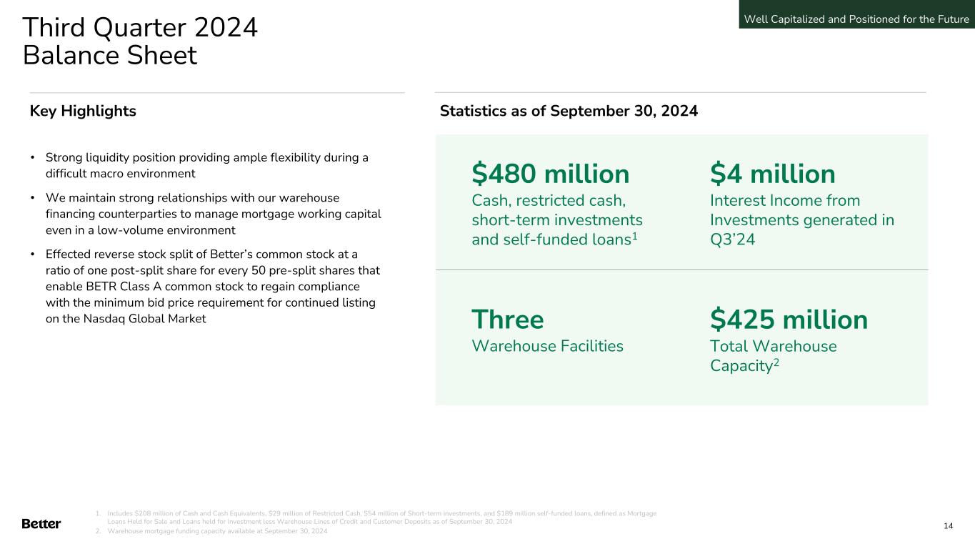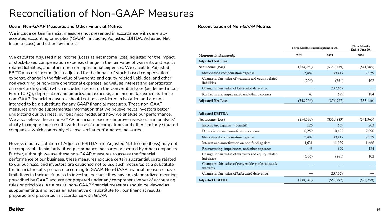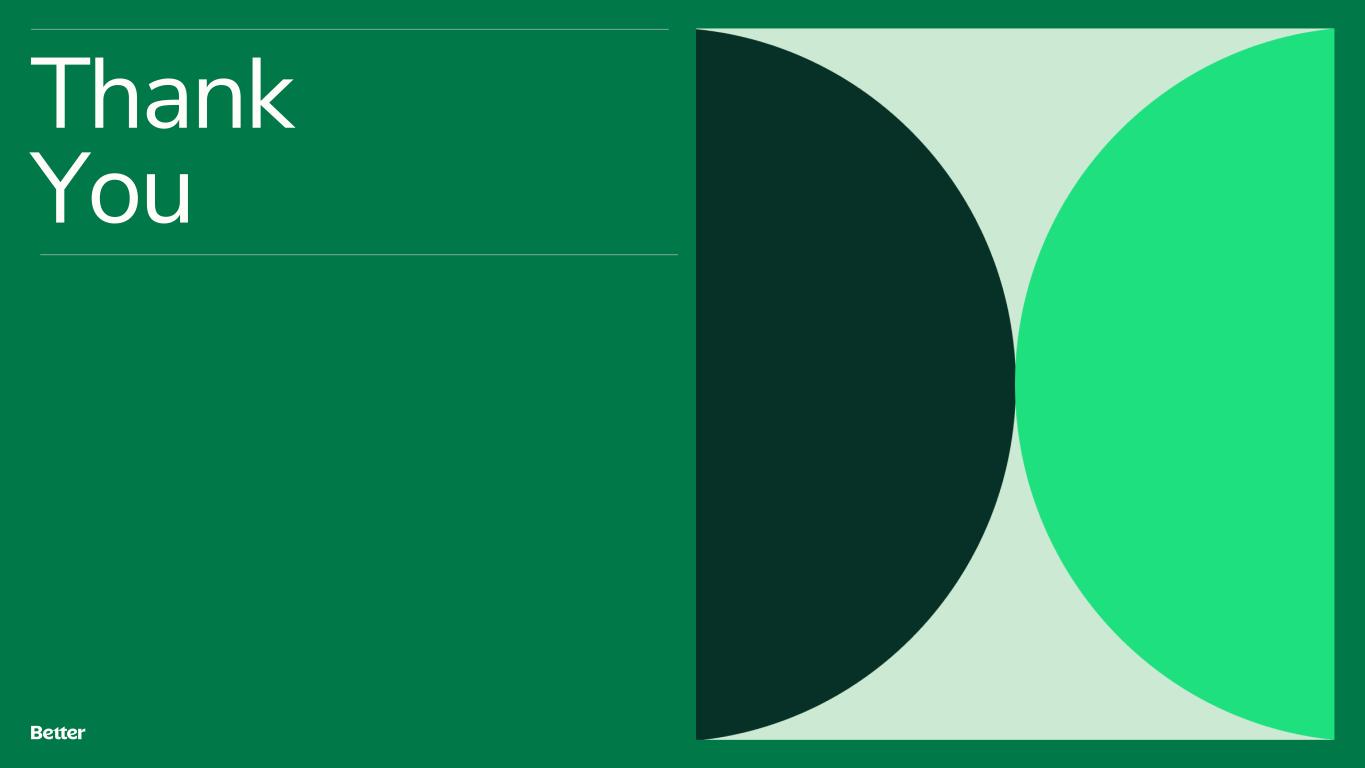 Disclaimer This presentation and any related oral presentation do not constitute an offer or invitation to subscribe for, purchase or otherwise acquire any securities or other instruments of Better Home & Finance Holding Company ("Better" or the "Company") and nothing contained herein or its presentation shall form the basis of any offer, contract or commitment whatsoever. The distribution of this presentation and any related oral presentation in certain jurisdictions may be restricted by law and persons into whose possession this presentation or any related oral presentation comes should inform themselves about, and observe, any such restriction. Any failure to comply with these restrictions may constitute a violation of the laws of any such other jurisdiction Forward Looking Statements This presentation contains certain forward-looking statements within the meaning of federal securities laws. Forward-looking statements are predictions, projections and other statements about future events that are based on current expectations and assumptions and, as a result, are subject to risks and uncertainties. Many factors could cause actual future events to differ materially from the forward-looking statements in this communication. Such factors can be found in the most recent annual report on Form 10-K, quarterly report on Form 10-Q and current reports on Form 8-K of Better Home & Finance Holding Company (“Better” or the “Company"), which are available, free of charge, at the SEC’s website at www.sec.gov. New risks and uncertainties arise from time to time, and it is impossible for Better to predict these events or how they may affect us. You are cautioned not to place undue reliance upon any forward-looking statements, which speak only as of the date made, and Better undertakes no obligation, except as required by law, to update or revise the forward-looking statements, whether as a result of new information, changes in expectations, future events or otherwise. Amounts described as of and for the quarter ended September 30, 2024 represent a preliminary estimate as of the date of this presentation and may be revised upon filing our Quarterly Report on Form 10-Q with the SEC. More information as of and for the quarter ended September 30, 2024 will be provided upon filing our Quarterly Report on Form 10-Q with SEC. Use of Non-GAAP Measures and Other Financial Metrics This presentation includes certain financial measures not presented in accordance with generally accepted accounting principles (“GAAP”), including Adjusted Net Income (Loss), Adjusted EBITDA and other key metrics. We calculate Adjusted Net Income (Loss) as net income (loss) adjusted for the impact of stock-based compensation expense, change in the fair value of warrants, change in the fair value of bifurcated derivative, and other non-core operational expenses. We calculate Adjusted EBITDA as net income (loss) adjusted for the impact of stock-based compensation expense, change in the fair value of warrants, change in the fair value of bifurcated derivative, and other non-recurring or non-core operational expenses, as well as interest and amortization on non-funding debt (which includes interest on the Convertible Note (as defined in our Form 10-Q)), depreciation and amortization expense, and income tax expense. These non-GAAP financial measures should not be considered in isolation and are not intended to be a substitute for any GAAP financial measures. These non- GAAP measures provide supplemental information that we believe helps investors better understand our business, our business model and how we analyze our performance. We also believe these non-GAAP financial measures improve investors’ and analysts’ ability to compare our results with those of our competitors and other similarly situated companies, which commonly disclose similar performance measures. However, our calculation of Adjusted EBITDA and Adjusted Net Income (Loss) may not be comparable to similarly titled performance measures presented by other companies. Further, although we use these non-GAAP measures to assess the financial performance of our business, these measures exclude certain substantial costs related to our business, and investors are cautioned not to use such measures as a substitute for financial results prepared according to GAAP. Non-GAAP financial measures have limitations in their usefulness to investors because they have no standardized meaning prescribed by GAAP and are not prepared under any comprehensive set of accounting rules or principles. As a result, non- GAAP financial measures should be viewed as supplementing, and not as an alternative or substitute for, our financial results prepared and presented in accordance with GAAP. For a reconciliation of non-GAAP measures used in this presentation to the closest comparable GAAP measures, see the “Reconciliation of Non-GAAP Measures” section of this presentation. Key Metrics In this presentation, we refer to the following key metrics: Funded Loan Volume represents the aggregate dollar amount of all loans funded in a given period based on the principal amount of the loan at funding. Refinance Loan Volume represents the aggregate dollar amount of refinance loans funded in a given period based on the principal amount of the loan at refinancing date. Purchase Loan Volume represents the aggregate dollar amount of purchase loans funded in a given period based on the principal amount of the loan at purchase date. HELOC Loan Volume represents the aggregate dollar amount of HELOC and closed-end second lien loans funded in a given period based on the principal amount of the loan at funding. D2C Loan Volume represents the aggregate dollar amount of loans funded in a given period based on the principal amount of the loan at funding that have been generated from direct interactions with customers using all marketing channels other than our B2B partner relationships. B2B Loan Volume repre