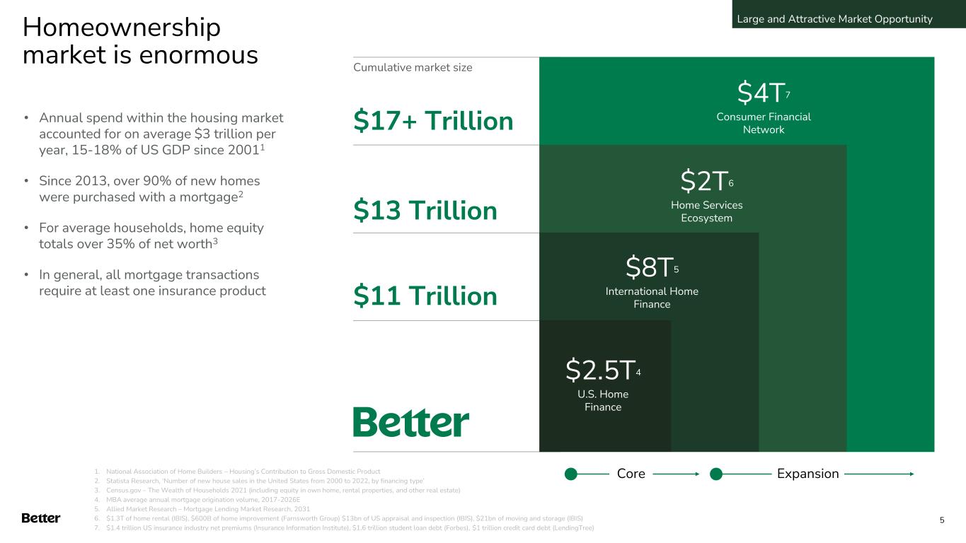 Our Vision Relentlessly making homeownership Better for our customers Faster Easier+ Better= Description Home Finance Full range of mortgage and home equity loan products LAUNCHED Jan 2016 One Day Mortgage Enhanced traditional mortgage product offering faster certainty LAUNCHED 1H 2023 Buy & Sell Homes Real estate agent matching engine LAUNCHED Nov 2018 Title One-click title policy matching service LAUNCHED Feb 2019 Homeowners Insurance One-click Homeowners Insurance policy matching service LAUNCHED Jan 2019 Our Progress Under one roof, with one-click Powered by our proprietary technology, Tinman, and customer and property data HELOC Monetize home equity without resetting your rate LAUNCHED 1H 2023 Large and Attractive Market Opportunity 4 Consumer Banking Banking services offered in the U.K. through Bank of Birmingham ACQUIRED 1H 2023