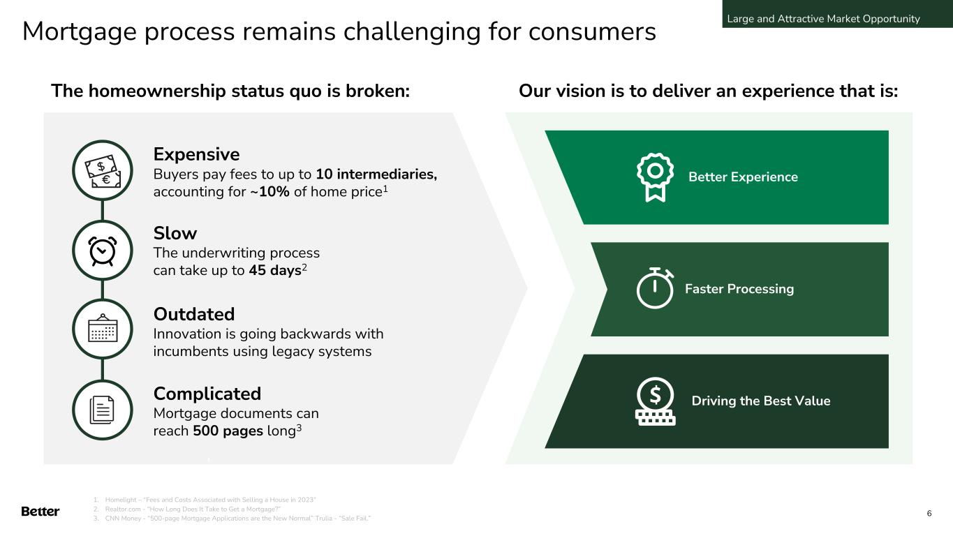 Homeownership market is enormous $11 Trillion $13 Trillion $17+ Trillion ~4T2 Financial Network ~2T Insurance (Title & Home) ~33tn U.S. Housing Market ~11tn1 U.S. Mortgage Core Expansion $4T7 Consumer Financial Network $2.5T4 U.S. Home Finance $8T5 International Home Finance $2T6 Home Services Ecosystem Cumulative market size 1. National Association of Home Builders – Housing’s Contribution to Gross Domestic Product 2. Statista Research, ‘Number of new house sales in the United States from 2000 to 2022, by financing type’ 3. Census.gov – The Wealth of Households 2021 (including equity in own home, rental properties, and other real estate) 4. MBA average annual mortgage origination volume, 2017-2026E 5. Allied Market Research – Mortgage Lending Market Research, 2031 6. $1.3T of home rental (IBIS), $600B of home improvement (Farnsworth Group) $13bn of US appraisal and inspection (IBIS), $21bn of moving and storage (IBIS) 7. $1.4 trillion US insurance industry net premiums (Insurance Information Institute), $1.6 trillion student loan debt (Forbes), $1 trillion credit card debt (LendingTree) • Annual spend within the housing market accounted for on average $3 trillion per year, 15-18% of US GDP since 20011 • Since 2013, over 90% of new homes were purchased with a mortgage2 • For average households, home equity totals over 35% of net worth3 • In general, all mortgage transactions require at least one insurance product Large and Attractive Market Opportunity 5