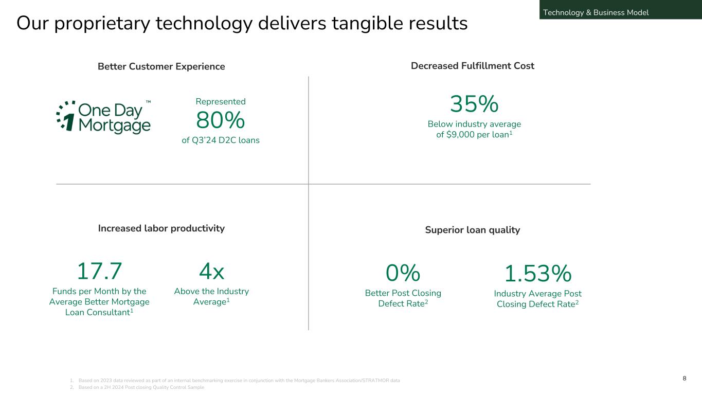 Our end-to-end proprietary technology, Tinman, powers our digital competitive advantage Home finance lifecycle Better Real Estate Better Title and Settlement Services Better Insurance Manual tasks to non- licensed team members Customer-facing tasks to licensed team members D2C B2B Better Team Members Loan Purchasers Buy Refi Cash- out HELOC Tinman is the backbone that drives our better and faster customer experience Technology & Business Model 7