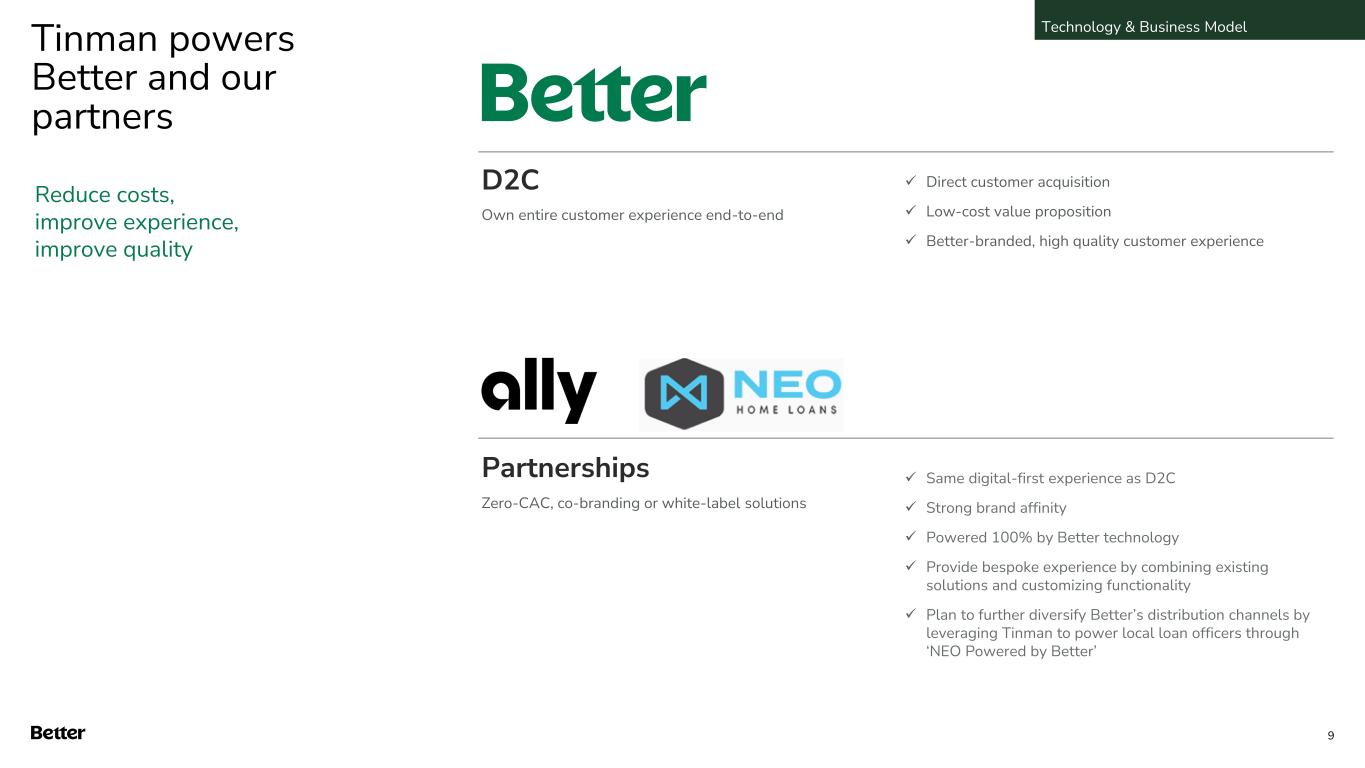 Our proprietary technology delivers tangible results Decreased Fulfillment Cost Increased labor productivity Superior loan quality Technology & Business Model 8 35% Below industry average of $9,000 per loan1 17.7 Funds per Month by the Average Better Mortgage Loan Consultant1 4x Above the Industry Average1 0% Better Post Closing Defect Rate2 1. Based on 2023 data reviewed as part of an internal benchmarking exercise in conjunction with the Mortgage Bankers Association/STRATMOR data 2. Based on a 2H 2024 Post closing Quality Control Sample 1.53% Industry Average Post Closing Defect Rate2 Better Customer Experience Represented 80% of Q3’24 D2C loans