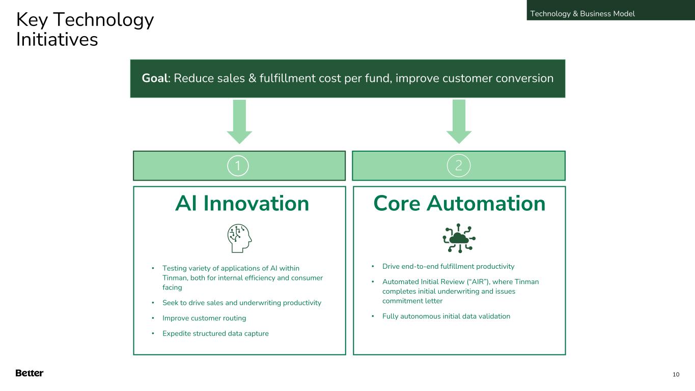 Tinman powers Better and our partners D2C Own entire customer experience end-to-end ✓ Direct customer acquisition ✓ Low-cost value proposition ✓ Better-branded, high quality customer experience Partnerships Zero-CAC, co-branding or white-label solutions ✓ Same digital-first experience as D2C ✓ Strong brand affinity ✓ Powered 100% by Better technology ✓ Provide bespoke experience by combining existing solutions and customizing functionality ✓ Plan to further diversify Better’s distribution channels by leveraging Tinman to power local loan officers through ‘NEO Powered by Better’ Reduce costs, improve experience, improve quality Technology & Business Model 9