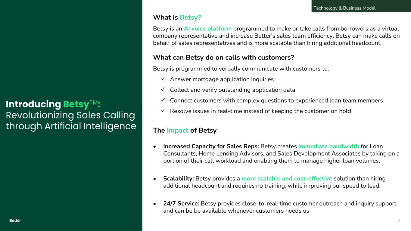 11 Introducing BetsyTM: Revolutionizing Sales Calling through Artificial Intelligence What is Betsy? Betsy is an AI voice platform programmed to make or take calls from borrowers as a virtual company representative and increase Better’s sales team efficiency. Betsy can make calls on behalf of sales representatives and is more scalable than hiring additional headcount. What can Betsy do on calls with customers? Betsy is programmed to verbally communicate with customers to: ✓ Answer mortgage application inquiries ✓ Collect and verify outstanding application data ✓ Connect customers with complex questions to experienced loan team members ✓ Resolve issues in real-time instead of keeping the customer on hold The Impact of Betsy • Increased Capacity for Sales Reps: Betsy creates immediate bandwidth for Loan Consultants, Home Lending Advisors, and Sales Development Associates by taking on a portion of their call workload and enabling them to manage higher loan volumes. • Scalability: Betsy provides a more scalable and cost-effective solution than hiring additional headcount and requires no training, while improving our speed to lead. • 24/7 Service: Betsy provides close-to-real-time customer outreach and inquiry support and can be be available whenever customers needs us Technology & Business Model