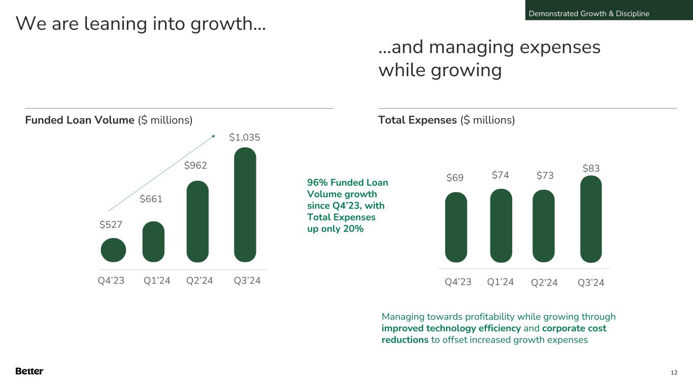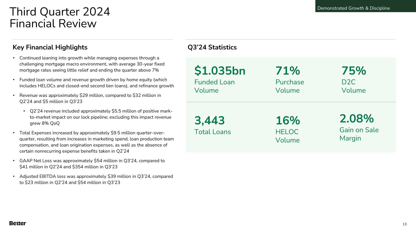 Q4’23 $69 Q1’24 $74 Total Expenses ($ millions) $73 Managing towards profitability while growing through improved technology efficiency and corporate cost reductions to offset increased growth expenses …and managing expenses while growing We are leaning into growth… Funded Loan Volume ($ millions) Q4’23 $527 Q1’24 $661 Q2’24 $962 Q3’24 $1,035 96% Funded Loan Volume growth since Q4’23, with Total Expenses up only 20% Demonstrated Growth & Discipline 12 Q2’24 Q3’24 $83