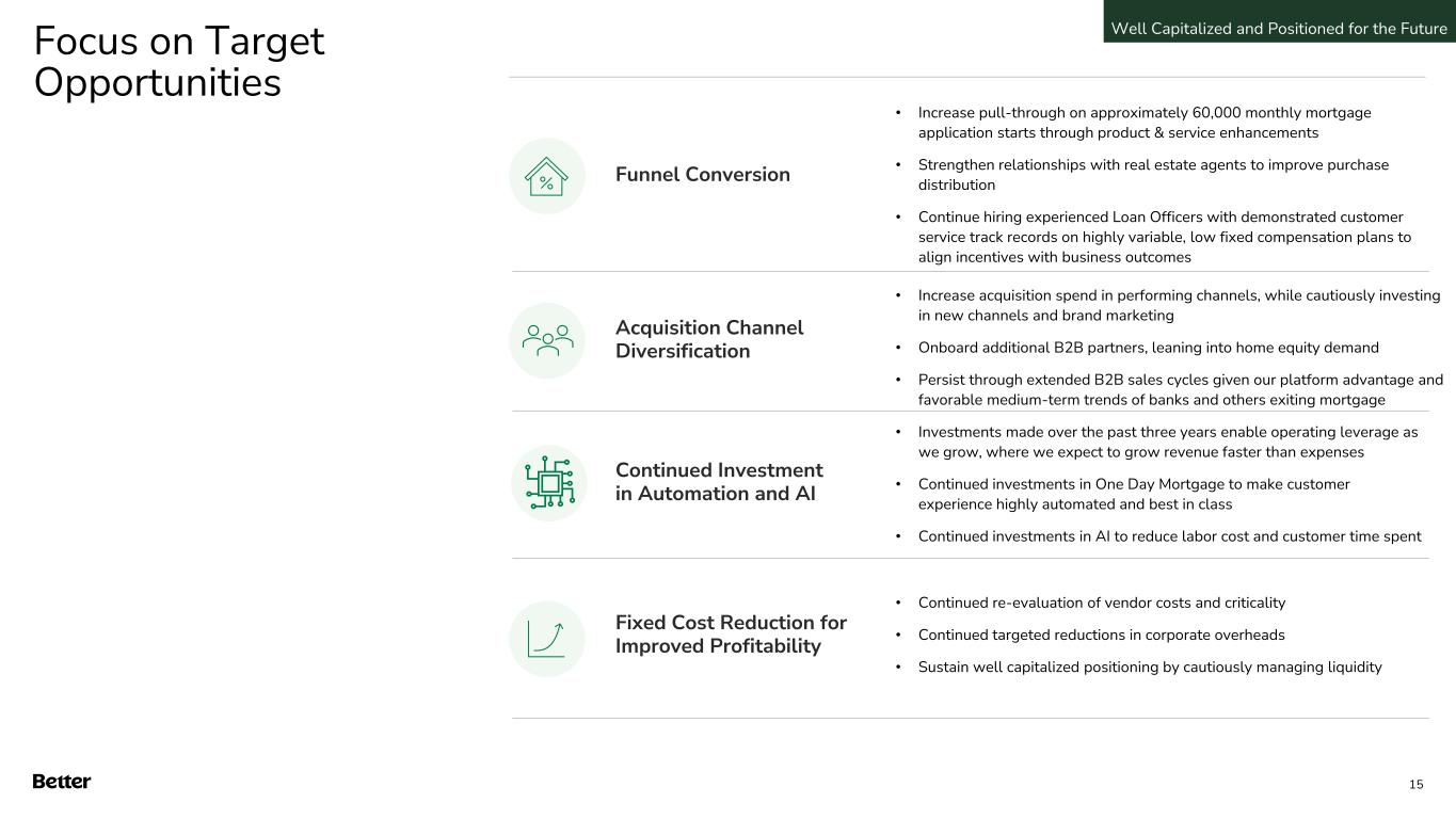 1. Includes $208 million of Cash and Cash Equivalents, $29 million of Restricted Cash, $54 million of Short-term investments, and $189 million self-funded loans, defined as Mortgage Loans Held for Sale and Loans held for Investment less Warehouse Lines of Credit and Customer Deposits as of September 30, 2024 2. Warehouse mortgage funding capacity available at September 30, 2024 Third Quarter 2024 Balance Sheet • Strong liquidity position providing ample flexibility during a difficult macro environment • We maintain strong relationships with our warehouse financing counterparties to manage mortgage working capital even in a low-volume environment • Effected reverse stock split of Better’s common stock at a ratio of one post-split share for every 50 pre-split shares that enable BETR Class A common stock to regain compliance with the minimum bid price requirement for continued listing on the Nasdaq Global Market Key Highlights Statistics as of September 30, 2024 $480 million Cash, restricted cash, short-term investments and self-funded loans1 $4 million Interest Income from Investments generated in Q3’24 Three Warehouse Facilities $425 million Total Warehouse Capacity2 Well Capitalized and Positioned for the Future 14