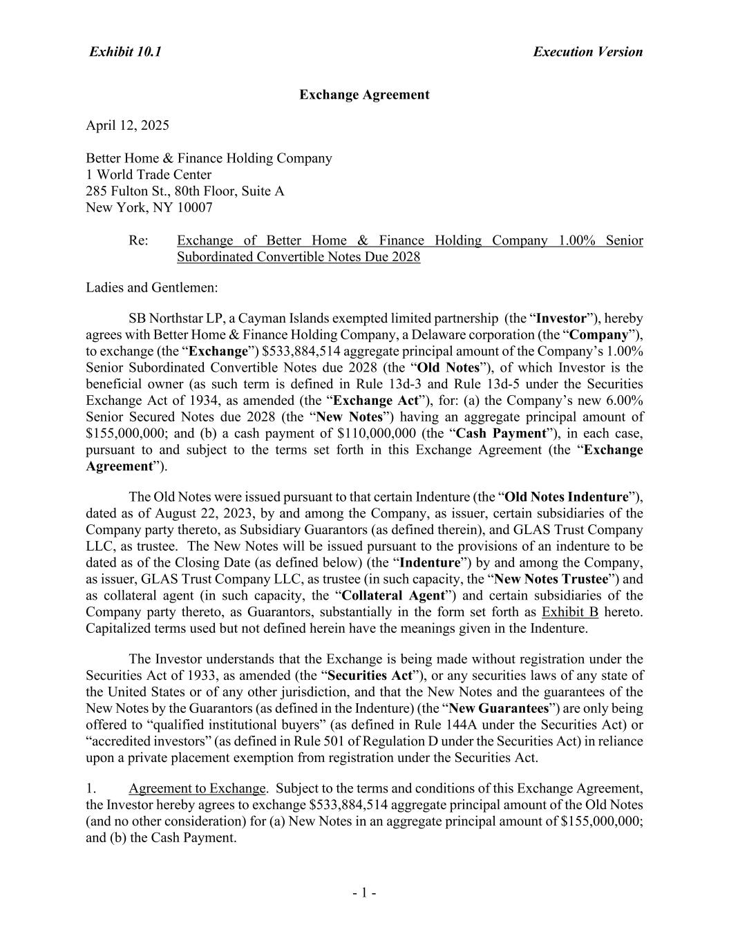 Exhibit 10.1 Execution Version - 1 - Exchange Agreement April 12, 2025 Better Home & Finance Holding Company 1 World Trade Center 285 Fulton St., 80th Floor, Suite A New York, NY 10007 Re: Exchange of Better Home & Finance Holding Company 1.00% Senior Subordinated Convertible Notes Due 2028 Ladies and Gentlemen: SB Northstar LP, a Cayman Islands exempted limited partnership (the “Investor”), hereby agrees with Better Home & Finance Holding Company, a Delaware corporation (the “Company”), to exchange (the “Exchange”) $533,884,514 aggregate principal amount of the Company’s 1.00% Senior Subordinated Convertible Notes due 2028 (the “Old Notes”), of which Investor is the beneficial owner (as such term is defined in Rule 13d-3 and Rule 13d-5 under the Securities Exchange Act of 1934, as amended (the “Exchange Act”), for: (a) the Company’s new 6.00% Senior Secured Notes due 2028 (the “New Notes”) having an aggregate principal amount of $155,000,000; and (b) a cash payment of $110,000,000 (the “Cash Payment”), in each case, pursuant to and subject to the terms set forth in this Exchange Agreement (the “Exchange Agreement”). The Old Notes were issued pursuant to that certain Indenture (the “Old Notes Indenture”), dated as of August 22, 2023, by and among the Company, as issuer, certain subsidiaries of the Company party thereto, as Subsidiary Guarantors (as defined therein), and GLAS Trust Company LLC, as trustee. The New Notes will be issued pursuant to the provisions of an indenture to be dated as of the Closing Date (as defined below) (the “Indenture”) by and among the Company, as issuer, GLAS Trust Company LLC, as trustee (in such capacity, the “New Notes Trustee”) and as collateral agent (in such capacity, the “Collateral Agent”) and certain subsidiaries of the Company party thereto, as Guarantors, substantially in the form set forth as Exhibit B hereto. Capitalized terms used but not defined herein have the meanings given in the Indenture. The Investor understands that the Exchange is being made without registration under the Securities Act of 1933, as amended (the “Securities Act”), or any securities laws of any state of the United States or of any other jurisdiction, and that the New Notes and the guarantees of the New Notes by the Guarantors (as defined in the Indenture) (the “New Guarantees”) are only being offered to “qualified institutional buyers” (as defined in Rule 144A under the Securities Act) or “accredited investors” (as defined in Rule 501 of Regulation D under the Securities Act) in reliance upon a private placement exemption from registration under the Securities Act. 1. Agreement to Exchange. Subject to the terms and conditions of this Exchange Agreement, the Investor hereby agrees to exchange $533,884,514 aggregate principal amount of the Old Notes (and no other consideration) for (a) New Notes in an aggregate principal amount of $155,000,000; and (b) the Cash Payment.