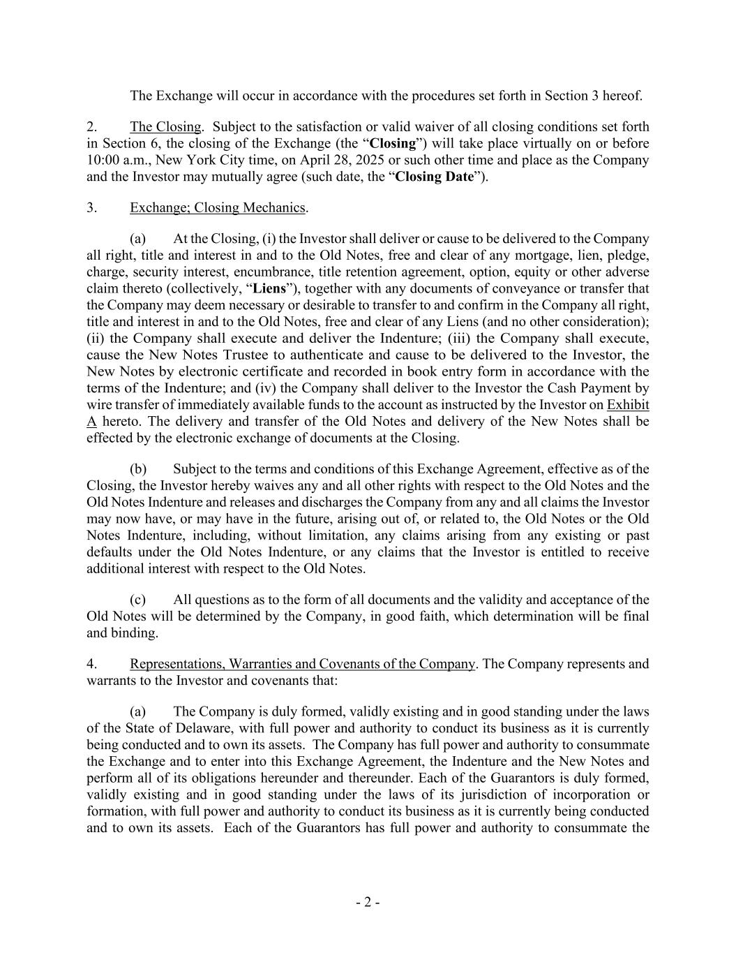 - 2 - The Exchange will occur in accordance with the procedures set forth in Section 3 hereof. 2. The Closing. Subject to the satisfaction or valid waiver of all closing conditions set forth in Section 6, the closing of the Exchange (the “Closing”) will take place virtually on or before 10:00 a.m., New York City time, on April 28, 2025 or such other time and place as the Company and the Investor may mutually agree (such date, the “Closing Date”). 3. Exchange; Closing Mechanics. (a) At the Closing, (i) the Investor shall deliver or cause to be delivered to the Company all right, title and interest in and to the Old Notes, free and clear of any mortgage, lien, pledge, charge, security interest, encumbrance, title retention agreement, option, equity or other adverse claim thereto (collectively, “Liens”), together with any documents of conveyance or transfer that the Company may deem necessary or desirable to transfer to and confirm in the Company all right, title and interest in and to the Old Notes, free and clear of any Liens (and no other consideration); (ii) the Company shall execute and deliver the Indenture; (iii) the Company shall execute, cause the New Notes Trustee to authenticate and cause to be delivered to the Investor, the New Notes by electronic certificate and recorded in book entry form in accordance with the terms of the Indenture; and (iv) the Company shall deliver to the Investor the Cash Payment by wire transfer of immediately available funds to the account as instructed by the Investor on Exhibit A hereto. The delivery and transfer of the Old Notes and delivery of the New Notes shall be effected by the electronic exchange of documents at the Closing. (b) Subject to the terms and conditions of this Exchange Agreement, effective as of the Closing, the Investor hereby waives any and all other rights with respect to the Old Notes and the Old Notes Indenture and releases and discharges the Company from any and all claims the Investor may now have, or may have in the future, arising out of, or related to, the Old Notes or the Old Notes Indenture, including, without limitation, any claims arising from any existing or past defaults under the Old Notes Indenture, or any claims that the Investor is entitled to receive additional interest with respect to the Old Notes. (c) All questions as to the form of all documents and the validity and acceptance of the Old Notes will be determined by the Company, in good faith, which determination will be final and binding. 4. Representations, Warranties and Covenants of the Company. The Company represents and warrants to the Investor and covenants that: (a) The Company is duly formed, validly existing and in good standing under the laws of the State of Delaware, with full power and authority to conduct its business as it is currently being conducted and to own its assets. The Company has full power and authority to consummate the Exchange and to enter into this Exchange Agreement, the Indenture and the New Notes and perform all of its obligations hereunder and thereunder. Each of the Guarantors is duly formed, validly existing and in good standing under the laws of its jurisdiction of incorporation or formation, with full power and authority to conduct its business as it is currently being conducted and to own its assets. Each of the Guarantors has full power and authority to consummate the