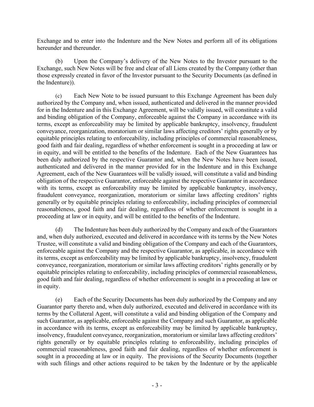 - 3 - Exchange and to enter into the Indenture and the New Notes and perform all of its obligations hereunder and thereunder. (b) Upon the Company’s delivery of the New Notes to the Investor pursuant to the Exchange, such New Notes will be free and clear of all Liens created by the Company (other than those expressly created in favor of the Investor pursuant to the Security Documents (as defined in the Indenture)). (c) Each New Note to be issued pursuant to this Exchange Agreement has been duly authorized by the Company and, when issued, authenticated and delivered in the manner provided for in the Indenture and in this Exchange Agreement, will be validly issued, will constitute a valid and binding obligation of the Company, enforceable against the Company in accordance with its terms, except as enforceability may be limited by applicable bankruptcy, insolvency, fraudulent conveyance, reorganization, moratorium or similar laws affecting creditors’ rights generally or by equitable principles relating to enforceability, including principles of commercial reasonableness, good faith and fair dealing, regardless of whether enforcement is sought in a proceeding at law or in equity, and will be entitled to the benefits of the Indenture. Each of the New Guarantees has been duly authorized by the respective Guarantor and, when the New Notes have been issued, authenticated and delivered in the manner provided for in the Indenture and in this Exchange Agreement, each of the New Guarantees will be validly issued, will constitute a valid and binding obligation of the respective Guarantor, enforceable against the respective Guarantor in accordance with its terms, except as enforceability may be limited by applicable bankruptcy, insolvency, fraudulent conveyance, reorganization, moratorium or similar laws affecting creditors’ rights generally or by equitable principles relating to enforceability, including principles of commercial reasonableness, good faith and fair dealing, regardless of whether enforcement is sought in a proceeding at law or in equity, and will be entitled to the benefits of the Indenture. (d) The Indenture has been duly authorized by the Company and each of the Guarantors and, when duly authorized, executed and delivered in accordance with its terms by the New Notes Trustee, will constitute a valid and binding obligation of the Company and each of the Guarantors, enforceable against the Company and the respective Guarantor, as applicable, in accordance with its terms, except as enforceability may be limited by applicable bankruptcy, insolvency, fraudulent conveyance, reorganization, moratorium or similar laws affecting creditors’ rights generally or by equitable principles relating to enforceability, including principles of commercial reasonableness, good faith and fair dealing, regardless of whether enforcement is sought in a proceeding at law or in equity. (e) Each of the Security Documents has been duly authorized by the Company and any Guarantor party thereto and, when duly authorized, executed and delivered in accordance with its terms by the Collateral Agent, will constitute a valid and binding obligation of the Company and such Guarantor, as applicable, enforceable against the Company and such Guarantor, as applicable in accordance with its terms, except as enforceability may be limited by applicable bankruptcy, insolvency, fraudulent conveyance, reorganization, moratorium or similar laws affecting creditors’ rights generally or by equitable principles relating to enforceability, including principles of commercial reasonableness, good faith and fair dealing, regardless of whether enforcement is sought in a proceeding at law or in equity. The provisions of the Security Documents (together with such filings and other actions required to be taken by the Indenture or by the applicable