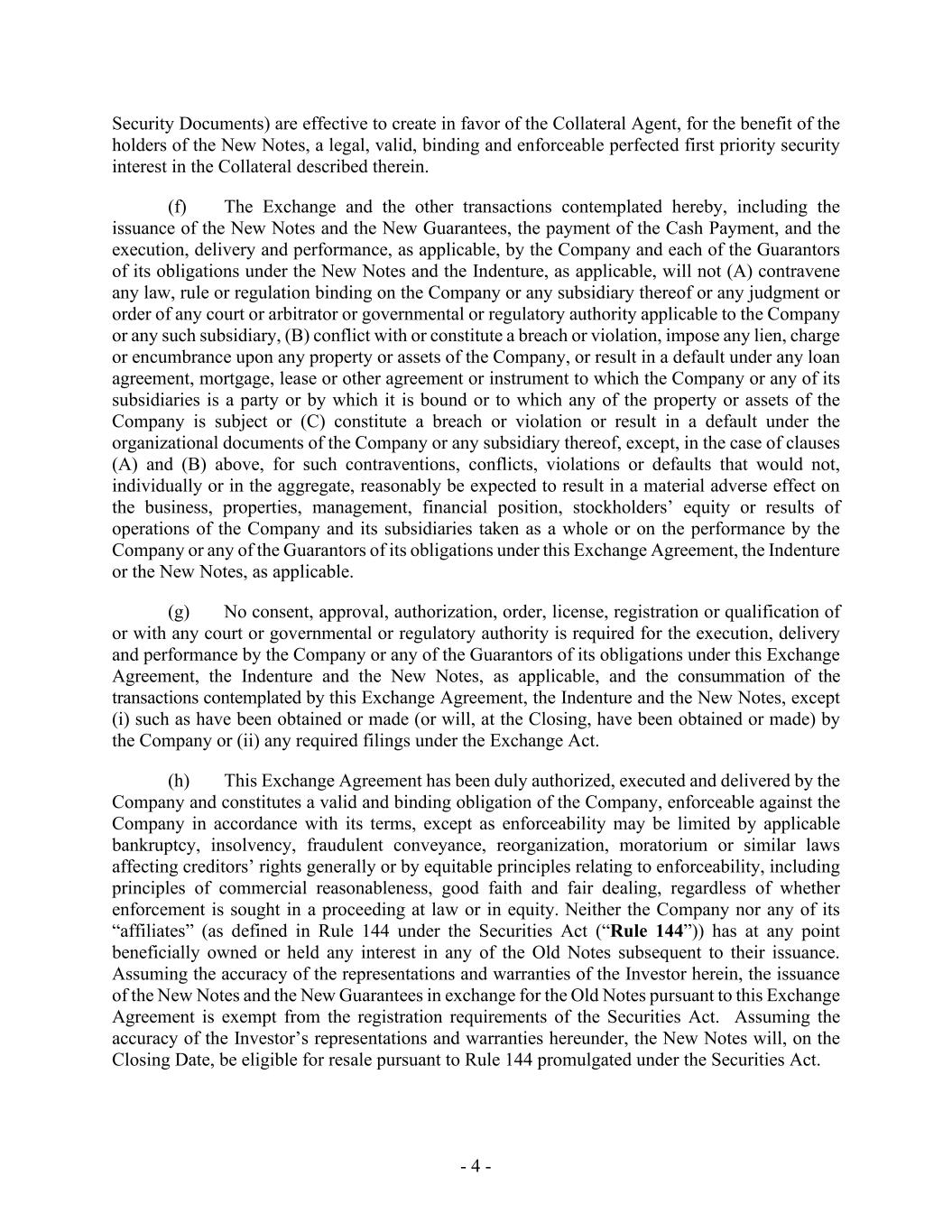 - 4 - Security Documents) are effective to create in favor of the Collateral Agent, for the benefit of the holders of the New Notes, a legal, valid, binding and enforceable perfected first priority security interest in the Collateral described therein. (f) The Exchange and the other transactions contemplated hereby, including the issuance of the New Notes and the New Guarantees, the payment of the Cash Payment, and the execution, delivery and performance, as applicable, by the Company and each of the Guarantors of its obligations under the New Notes and the Indenture, as applicable, will not (A) contravene any law, rule or regulation binding on the Company or any subsidiary thereof or any judgment or order of any court or arbitrator or governmental or regulatory authority applicable to the Company or any such subsidiary, (B) conflict with or constitute a breach or violation, impose any lien, charge or encumbrance upon any property or assets of the Company, or result in a default under any loan agreement, mortgage, lease or other agreement or instrument to which the Company or any of its subsidiaries is a party or by which it is bound or to which any of the property or assets of the Company is subject or (C) constitute a breach or violation or result in a default under the organizational documents of the Company or any subsidiary thereof, except, in the case of clauses (A) and (B) above, for such contraventions, conflicts, violations or defaults that would not, individually or in the aggregate, reasonably be expected to result in a material adverse effect on the business, properties, management, financial position, stockholders’ equity or results of operations of the Company and its subsidiaries taken as a whole or on the performance by the Company or any of the Guarantors of its obligations under this Exchange Agreement, the Indenture or the New Notes, as applicable. (g) No consent, approval, authorization, order, license, registration or qualification of or with any court or governmental or regulatory authority is required for the execution, delivery and performance by the Company or any of the Guarantors of its obligations under this Exchange Agreement, the Indenture and the New Notes, as applicable, and the consummation of the transactions contemplated by this Exchange Agreement, the Indenture and the New Notes, except (i) such as have been obtained or made (or will, at the Closing, have been obtained or made) by the Company or (ii) any required filings under the Exchange Act. (h) This Exchange Agreement has been duly authorized, executed and delivered by the Company and constitutes a valid and binding obligation of the Company, enforceable against the Company in accordance with its terms, except as enforceability may be limited by applicable bankruptcy, insolvency, fraudulent conveyance, reorganization, moratorium or similar laws affecting creditors’ rights generally or by equitable principles relating to enforceability, including principles of commercial reasonableness, good faith and fair dealing, regardless of whether enforcement is sought in a proceeding at law or in equity. Neither the Company nor any of its “affiliates” (as defined in Rule 144 under the Securities Act (“Rule 144”)) has at any point beneficially owned or held any interest in any of the Old Notes subsequent to their issuance. Assuming the accuracy of the representations and warranties of the Investor herein, the issuance of the New Notes and the New Guarantees in exchange for the Old Notes pursuant to this Exchange Agreement is exempt from the registration requirements of the Securities Act. Assuming the accuracy of the Investor’s representations and warranties hereunder, the New Notes will, on the Closing Date, be eligible for resale pursuant to Rule 144 promulgated under the Securities Act.