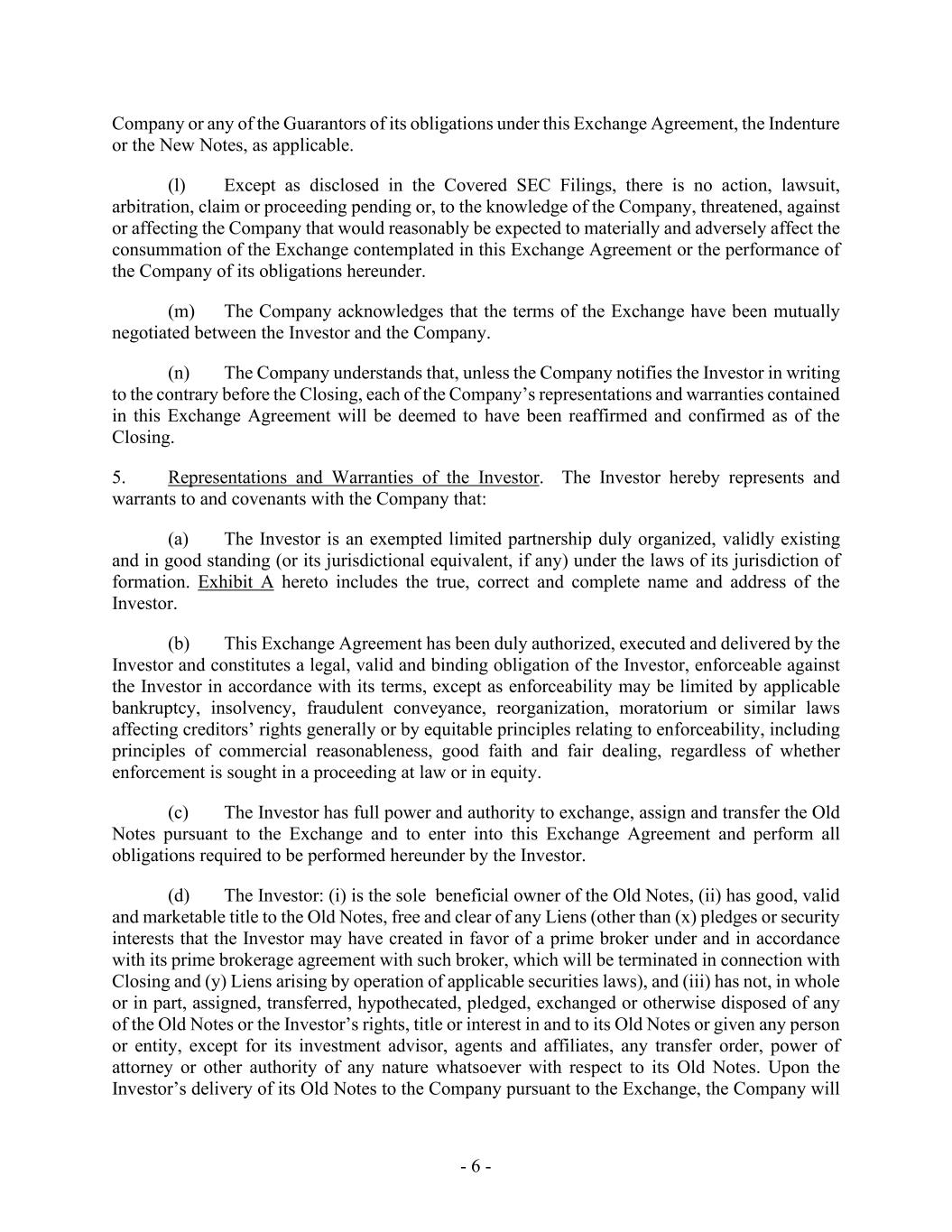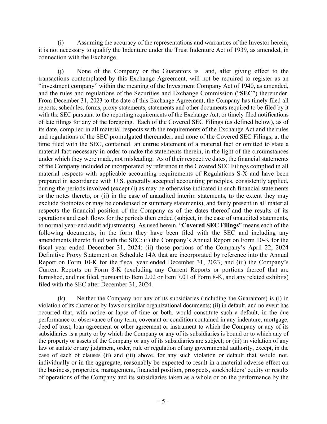 - 5 - (i) Assuming the accuracy of the representations and warranties of the Investor herein, it is not necessary to qualify the Indenture under the Trust Indenture Act of 1939, as amended, in connection with the Exchange. (j) None of the Company or the Guarantors is and, after giving effect to the transactions contemplated by this Exchange Agreement, will not be required to register as an “investment company” within the meaning of the Investment Company Act of 1940, as amended, and the rules and regulations of the Securities and Exchange Commission (“SEC”) thereunder. From December 31, 2023 to the date of this Exchange Agreement, the Company has timely filed all reports, schedules, forms, proxy statements, statements and other documents required to be filed by it with the SEC pursuant to the reporting requirements of the Exchange Act, or timely filed notifications of late filings for any of the foregoing. Each of the Covered SEC Filings (as defined below), as of its date, complied in all material respects with the requirements of the Exchange Act and the rules and regulations of the SEC promulgated thereunder, and none of the Covered SEC Filings, at the time filed with the SEC, contained an untrue statement of a material fact or omitted to state a material fact necessary in order to make the statements therein, in the light of the circumstances under which they were made, not misleading. As of their respective dates, the financial statements of the Company included or incorporated by reference in the Covered SEC Filings complied in all material respects with applicable accounting requirements of Regulations S-X and have been prepared in accordance with U.S. generally accepted accounting principles, consistently applied, during the periods involved (except (i) as may be otherwise indicated in such financial statements or the notes thereto, or (ii) in the case of unaudited interim statements, to the extent they may exclude footnotes or may be condensed or summary statements), and fairly present in all material respects the financial position of the Company as of the dates thereof and the results of its operations and cash flows for the periods then ended (subject, in the case of unaudited statements, to normal year-end audit adjustments). As used herein, “Covered SEC Filings” means each of the following documents, in the form they have been filed with the SEC and including any amendments thereto filed with the SEC: (i) the Company’s Annual Report on Form 10-K for the fiscal year ended December 31, 2024; (ii) those portions of the Company’s April 22, 2024 Definitive Proxy Statement on Schedule 14A that are incorporated by reference into the Annual Report on Form 10-K for the fiscal year ended December 31, 2023; and (iii) the Company’s Current Reports on Form 8-K (excluding any Current Reports or portions thereof that are furnished, and not filed, pursuant to Item 2.02 or Item 7.01 of Form 8-K, and any related exhibits) filed with the SEC after December 31, 2024. (k) Neither the Company nor any of its subsidiaries (including the Guarantors) is (i) in violation of its charter or by-laws or similar organizational documents; (ii) in default, and no event has occurred that, with notice or lapse of time or both, would constitute such a default, in the due performance or observance of any term, covenant or condition contained in any indenture, mortgage, deed of trust, loan agreement or other agreement or instrument to which the Company or any of its subsidiaries is a party or by which the Company or any of its subsidiaries is bound or to which any of the property or assets of the Company or any of its subsidiaries are subject; or (iii) in violation of any law or statute or any judgment, order, rule or regulation of any governmental authority, except, in the case of each of clauses (ii) and (iii) above, for any such violation or default that would not, individually or in the aggregate, reasonably be expected to result in a material adverse effect on the business, properties, management, financial position, prospects, stockholders’ equity or results of operations of the Company and its subsidiaries taken as a whole or on the performance by the