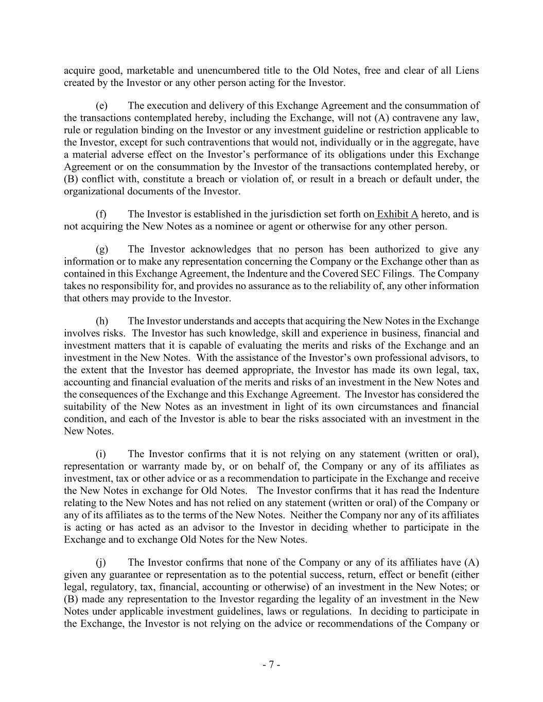- 7 - acquire good, marketable and unencumbered title to the Old Notes, free and clear of all Liens created by the Investor or any other person acting for the Investor. (e) The execution and delivery of this Exchange Agreement and the consummation of the transactions contemplated hereby, including the Exchange, will not (A) contravene any law, rule or regulation binding on the Investor or any investment guideline or restriction applicable to the Investor, except for such contraventions that would not, individually or in the aggregate, have a material adverse effect on the Investor’s performance of its obligations under this Exchange Agreement or on the consummation by the Investor of the transactions contemplated hereby, or (B) conflict with, constitute a breach or violation of, or result in a breach or default under, the organizational documents of the Investor. (f) The Investor is established in the jurisdiction set forth on Exhibit A hereto, and is not acquiring the New Notes as a nominee or agent or otherwise for any other person. (g) The Investor acknowledges that no person has been authorized to give any information or to make any representation concerning the Company or the Exchange other than as contained in this Exchange Agreement, the Indenture and the Covered SEC Filings. The Company takes no responsibility for, and provides no assurance as to the reliability of, any other information that others may provide to the Investor. (h) The Investor understands and accepts that acquiring the New Notes in the Exchange involves risks. The Investor has such knowledge, skill and experience in business, financial and investment matters that it is capable of evaluating the merits and risks of the Exchange and an investment in the New Notes. With the assistance of the Investor’s own professional advisors, to the extent that the Investor has deemed appropriate, the Investor has made its own legal, tax, accounting and financial evaluation of the merits and risks of an investment in the New Notes and the consequences of the Exchange and this Exchange Agreement. The Investor has considered the suitability of the New Notes as an investment in light of its own circumstances and financial condition, and each of the Investor is able to bear the risks associated with an investment in the New Notes. (i) The Investor confirms that it is not relying on any statement (written or oral), representation or warranty made by, or on behalf of, the Company or any of its affiliates as investment, tax or other advice or as a recommendation to participate in the Exchange and receive the New Notes in exchange for Old Notes. The Investor confirms that it has read the Indenture relating to the New Notes and has not relied on any statement (written or oral) of the Company or any of its affiliates as to the terms of the New Notes. Neither the Company nor any of its affiliates is acting or has acted as an advisor to the Investor in deciding whether to participate in the Exchange and to exchange Old Notes for the New Notes. (j) The Investor confirms that none of the Company or any of its affiliates have (A) given any guarantee or representation as to the potential success, return, effect or benefit (either legal, regulatory, tax, financial, accounting or otherwise) of an investment in the New Notes; or (B) made any representation to the Investor regarding the legality of an investment in the New Notes under applicable investment guidelines, laws or regulations. In deciding to participate in the Exchange, the Investor is not relying on the advice or recommendations of the Company or