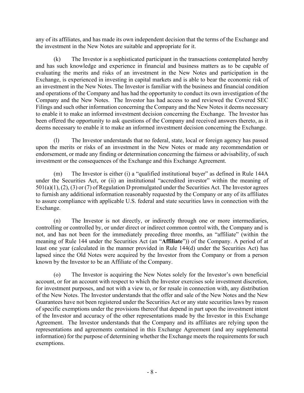 - 8 - any of its affiliates, and has made its own independent decision that the terms of the Exchange and the investment in the New Notes are suitable and appropriate for it. (k) The Investor is a sophisticated participant in the transactions contemplated hereby and has such knowledge and experience in financial and business matters as to be capable of evaluating the merits and risks of an investment in the New Notes and participation in the Exchange, is experienced in investing in capital markets and is able to bear the economic risk of an investment in the New Notes. The Investor is familiar with the business and financial condition and operations of the Company and has had the opportunity to conduct its own investigation of the Company and the New Notes. The Investor has had access to and reviewed the Covered SEC Filings and such other information concerning the Company and the New Notes it deems necessary to enable it to make an informed investment decision concerning the Exchange. The Investor has been offered the opportunity to ask questions of the Company and received answers thereto, as it deems necessary to enable it to make an informed investment decision concerning the Exchange. (l) The Investor understands that no federal, state, local or foreign agency has passed upon the merits or risks of an investment in the New Notes or made any recommendation or endorsement, or made any finding or determination concerning the fairness or advisability, of such investment or the consequences of the Exchange and this Exchange Agreement. (m) The Investor is either (i) a “qualified institutional buyer” as defined in Rule 144A under the Securities Act, or (ii) an institutional “accredited investor” within the meaning of 501(a)(1), (2), (3) or (7) of Regulation D promulgated under the Securities Act. The Investor agrees to furnish any additional information reasonably requested by the Company or any of its affiliates to assure compliance with applicable U.S. federal and state securities laws in connection with the Exchange. (n) The Investor is not directly, or indirectly through one or more intermediaries, controlling or controlled by, or under direct or indirect common control with, the Company and is not, and has not been for the immediately preceding three months, an “affiliate” (within the meaning of Rule 144 under the Securities Act (an “Affiliate”)) of the Company. A period of at least one year (calculated in the manner provided in Rule 144(d) under the Securities Act) has lapsed since the Old Notes were acquired by the Investor from the Company or from a person known by the Investor to be an Affiliate of the Company. (o) The Investor is acquiring the New Notes solely for the Investor’s own beneficial account, or for an account with respect to which the Investor exercises sole investment discretion, for investment purposes, and not with a view to, or for resale in connection with, any distribution of the New Notes. The Investor understands that the offer and sale of the New Notes and the New Guarantees have not been registered under the Securities Act or any state securities laws by reason of specific exemptions under the provisions thereof that depend in part upon the investment intent of the Investor and accuracy of the other representations made by the Investor in this Exchange Agreement. The Investor understands that the Company and its affiliates are relying upon the representations and agreements contained in this Exchange Agreement (and any supplemental information) for the purpose of determining whether the Exchange meets the requirements for such exemptions.