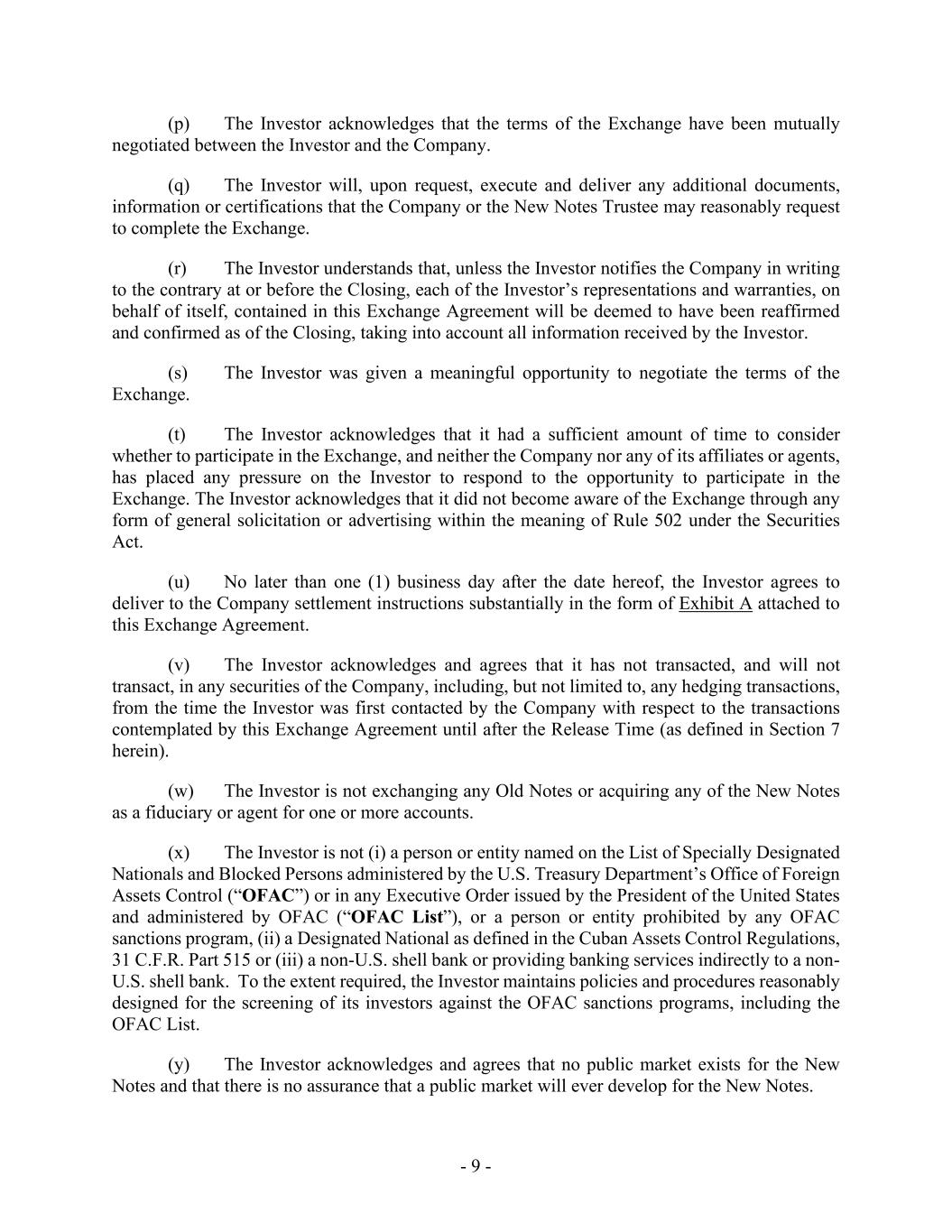 - 9 - (p) The Investor acknowledges that the terms of the Exchange have been mutually negotiated between the Investor and the Company. (q) The Investor will, upon request, execute and deliver any additional documents, information or certifications that the Company or the New Notes Trustee may reasonably request to complete the Exchange. (r) The Investor understands that, unless the Investor notifies the Company in writing to the contrary at or before the Closing, each of the Investor’s representations and warranties, on behalf of itself, contained in this Exchange Agreement will be deemed to have been reaffirmed and confirmed as of the Closing, taking into account all information received by the Investor. (s) The Investor was given a meaningful opportunity to negotiate the terms of the Exchange. (t) The Investor acknowledges that it had a sufficient amount of time to consider whether to participate in the Exchange, and neither the Company nor any of its affiliates or agents, has placed any pressure on the Investor to respond to the opportunity to participate in the Exchange. The Investor acknowledges that it did not become aware of the Exchange through any form of general solicitation or advertising within the meaning of Rule 502 under the Securities Act. (u) No later than one (1) business day after the date hereof, the Investor agrees to deliver to the Company settlement instructions substantially in the form of Exhibit A attached to this Exchange Agreement. (v) The Investor acknowledges and agrees that it has not transacted, and will not transact, in any securities of the Company, including, but not limited to, any hedging transactions, from the time the Investor was first contacted by the Company with respect to the transactions contemplated by this Exchange Agreement until after the Release Time (as defined in Section 7 herein). (w) The Investor is not exchanging any Old Notes or acquiring any of the New Notes as a fiduciary or agent for one or more accounts. (x) The Investor is not (i) a person or entity named on the List of Specially Designated Nationals and Blocked Persons administered by the U.S. Treasury Department’s Office of Foreign Assets Control (“OFAC”) or in any Executive Order issued by the President of the United States and administered by OFAC (“OFAC List”), or a person or entity prohibited by any OFAC sanctions program, (ii) a Designated National as defined in the Cuban Assets Control Regulations, 31 C.F.R. Part 515 or (iii) a non-U.S. shell bank or providing banking services indirectly to a non- U.S. shell bank. To the extent required, the Investor maintains policies and procedures reasonably designed for the screening of its investors against the OFAC sanctions programs, including the OFAC List. (y) The Investor acknowledges and agrees that no public market exists for the New Notes and that there is no assurance that a public market will ever develop for the New Notes.